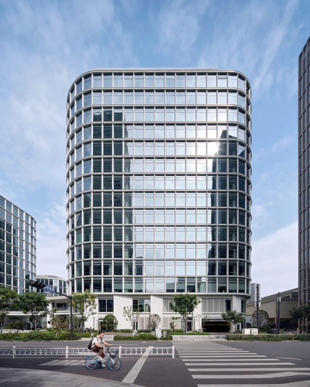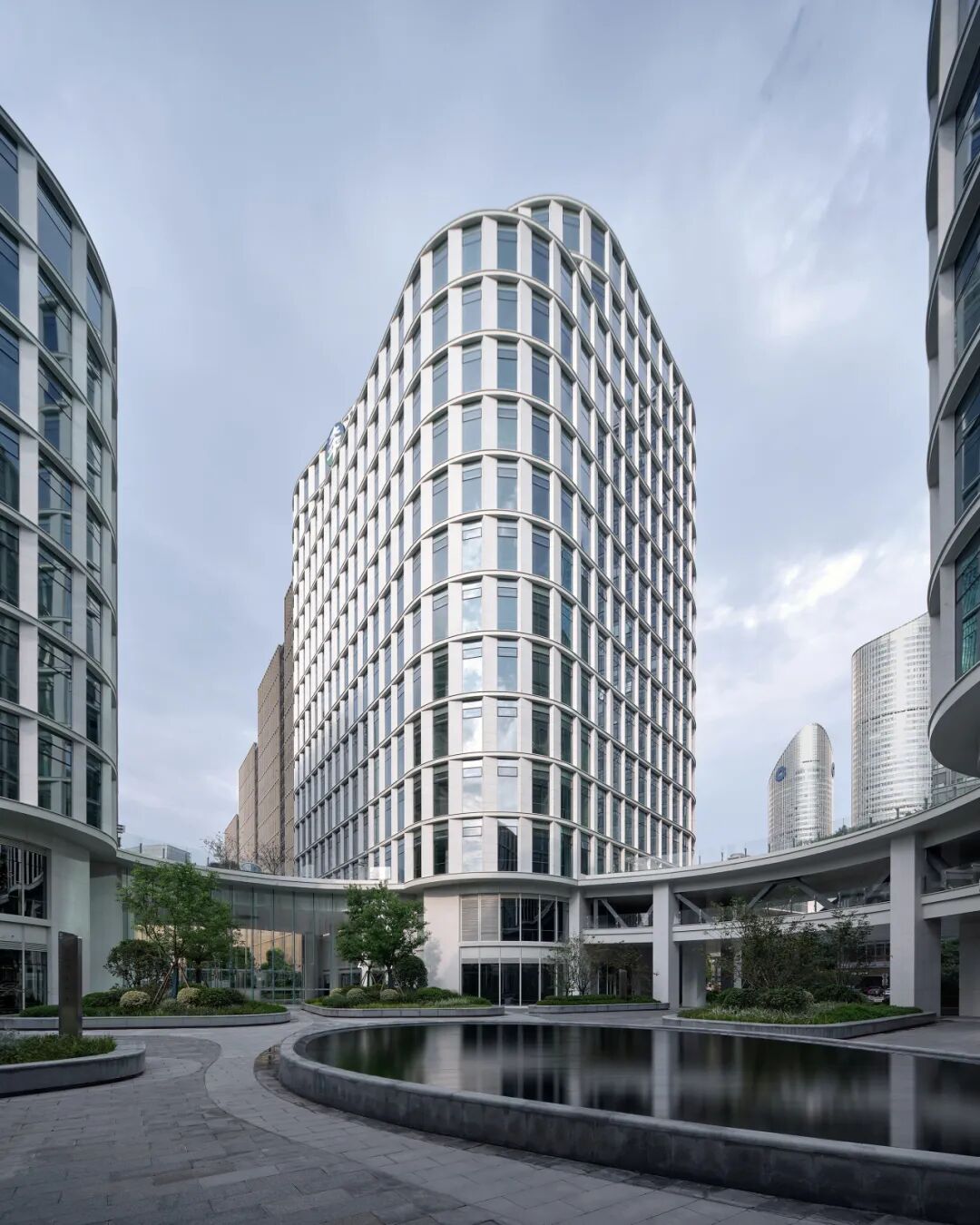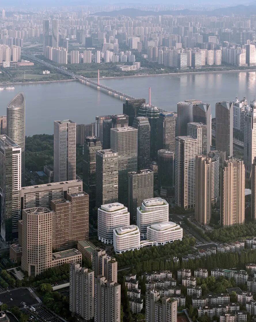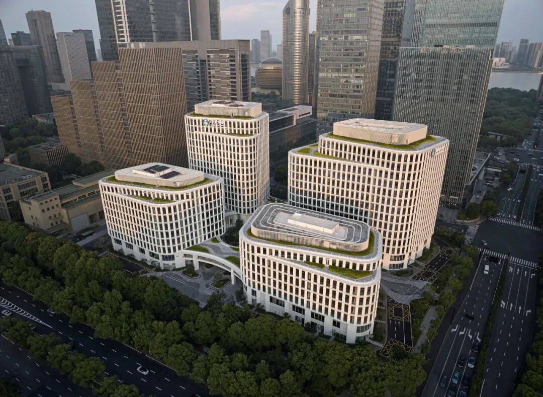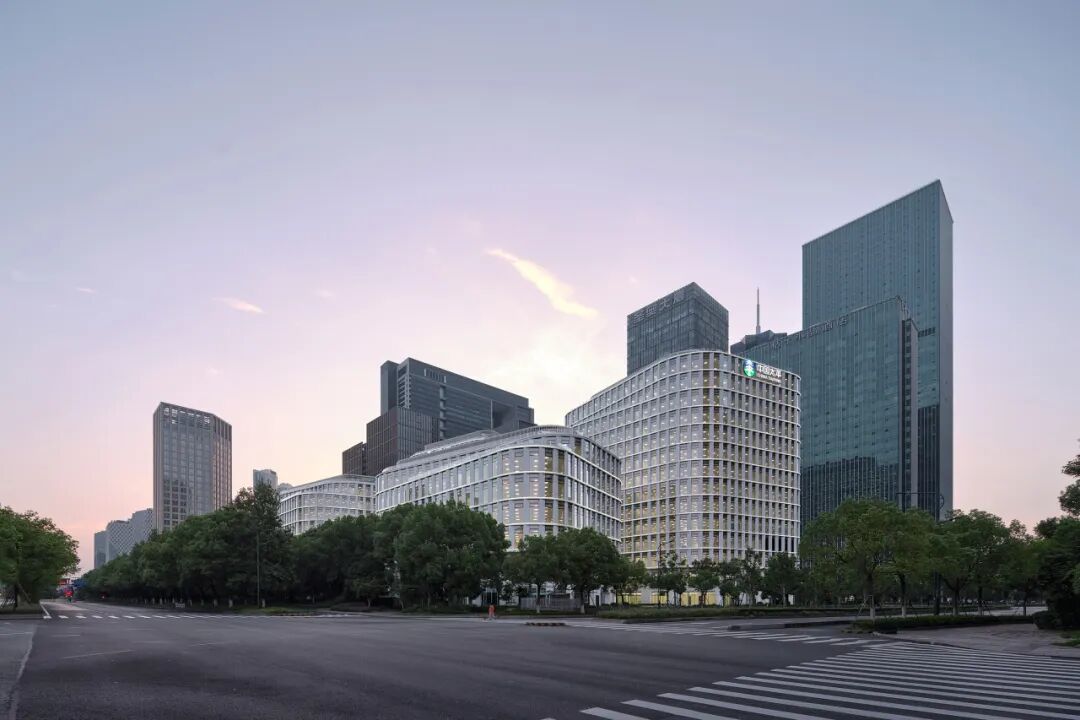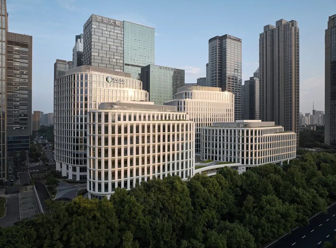 设计灵感源自杭州的文化象征“梁祝”,采用形态优美而动感的蝶状布局,将建筑分布于地块的四个角落,通过两层高的裙楼和连廊将四座高楼相连。这种布局宛如展翅的蝴蝶,优雅和谐。