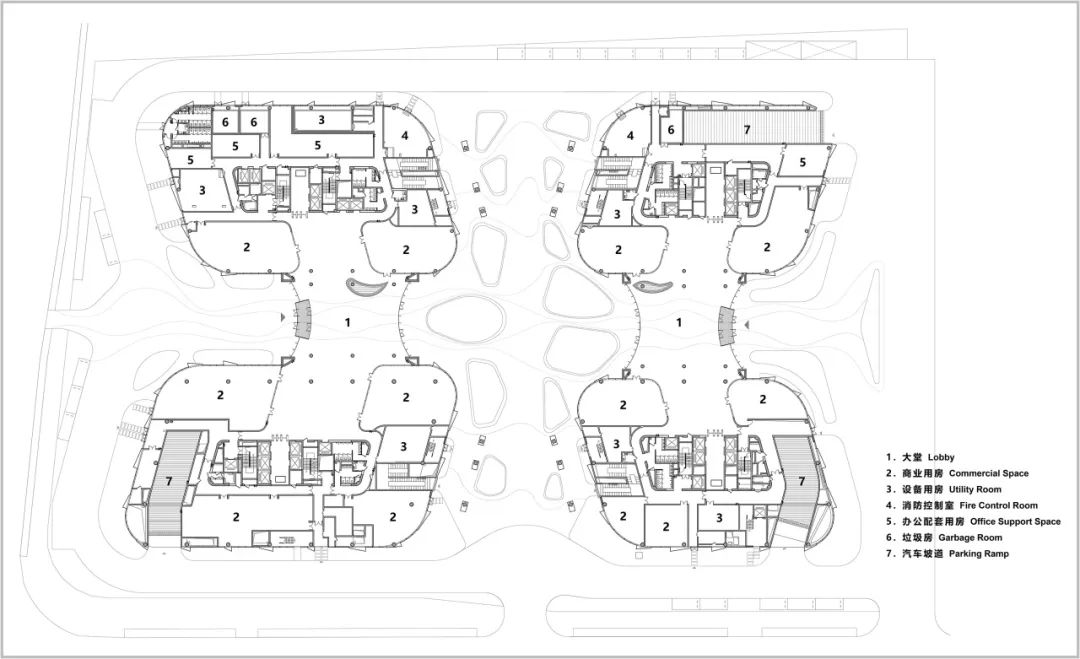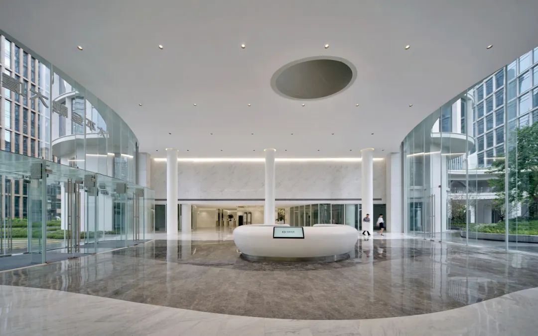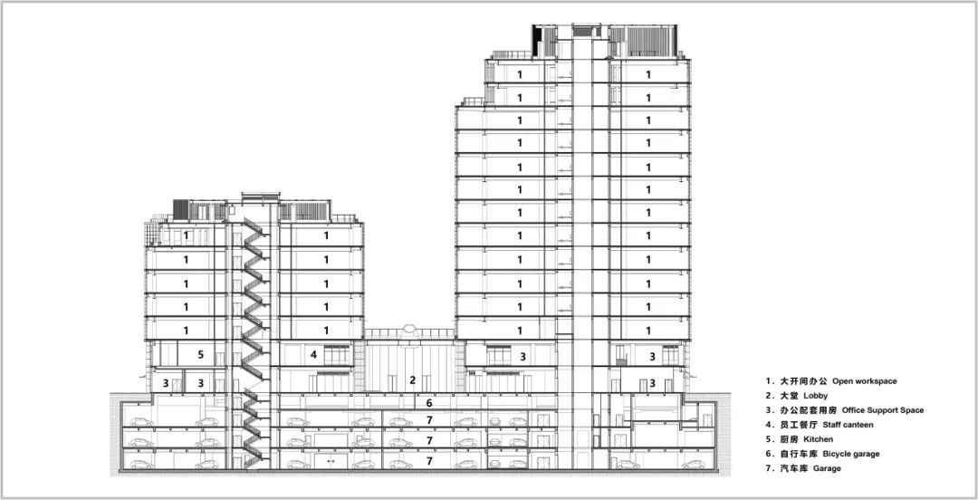南北两侧各设有两层高的玻璃大堂,连接了街道、门厅和内部花园。裙房包含员工餐厅以及商业配套功能,通过连廊方便员工共享。商务办公功能从第三层开始。