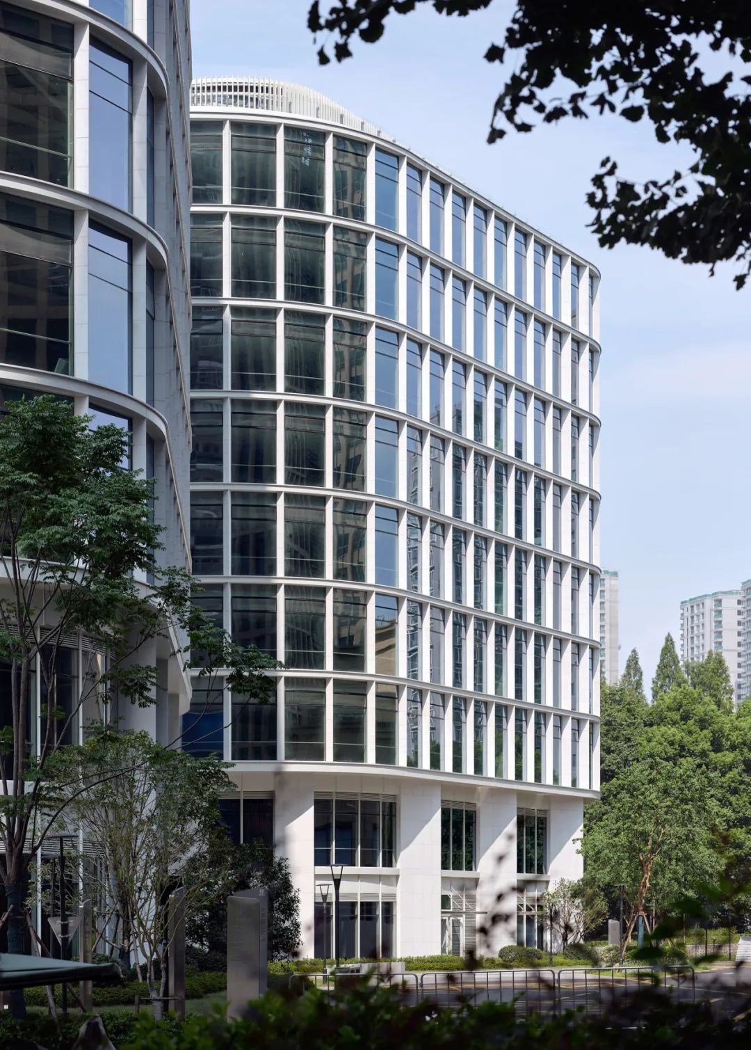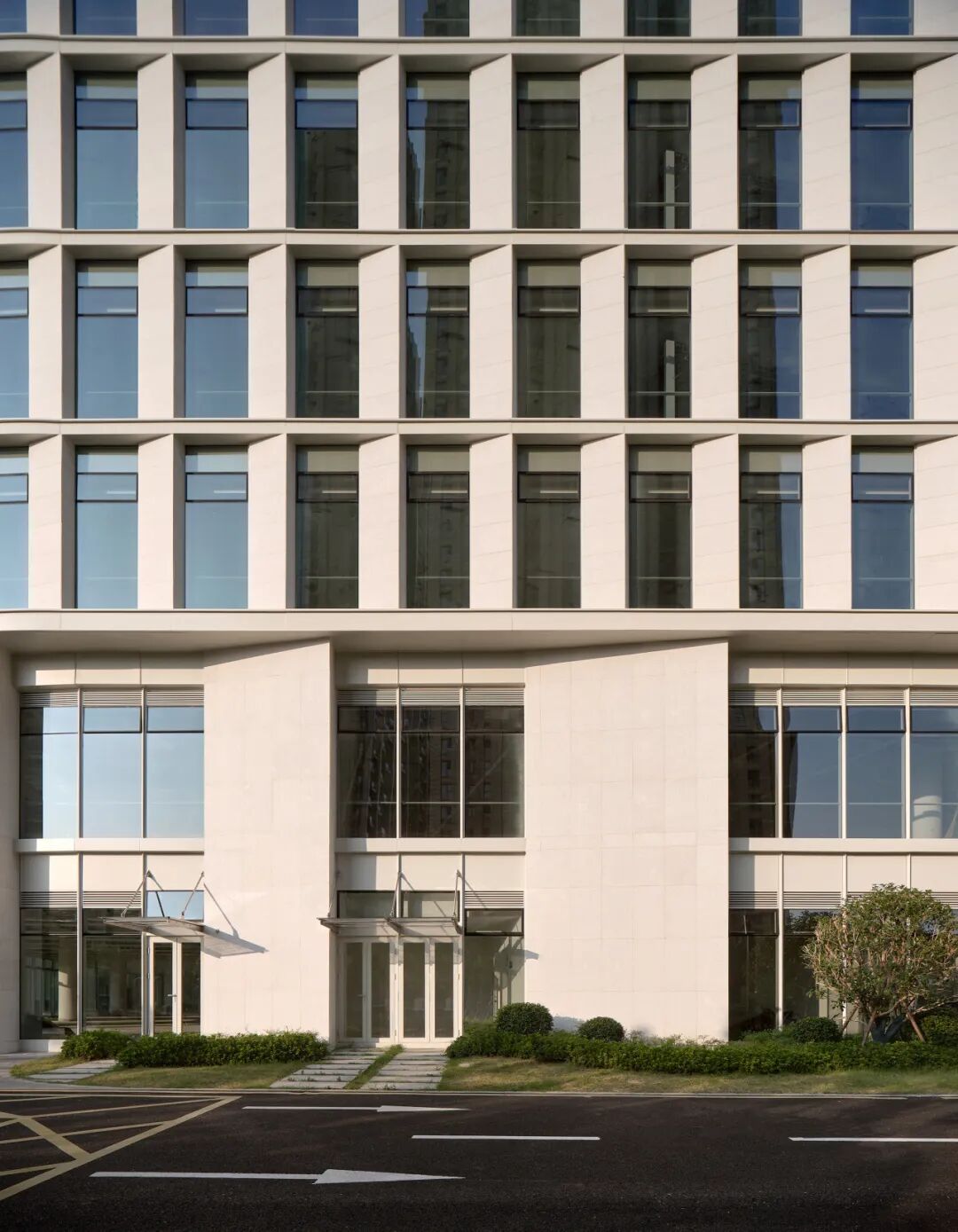 而面向内部的建筑表皮则更为通透、精致,这种内外对立而统一的设计凸显了既稳重又活跃的内涵。同时根据不同朝向和高度,按采光需求来分配不同的石材与玻璃的面积比例,提升了建筑的节能性能。