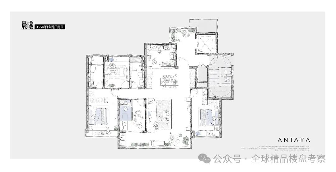 建面约220㎡四房两厅三卫户型:约8.5m横厅空间,人生阔境,由此而起。约11.8m跑道式奢阔阳台设计,将尺度感拉满。主卧套房配备270°转角飘窗,一城美景尽收眼底!