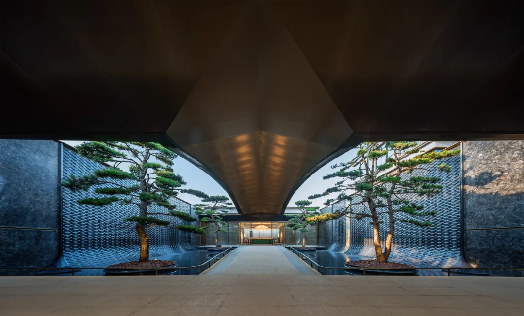 作为“建筑第一大堂”的车库部分,金陵月华躬耕深研,设计约7米净宽地下坡道入口,与小区大门同高,留出了足够的顶部空间,顶部中式折叠金属板华盖设计,呈现华贵归家礼仪。