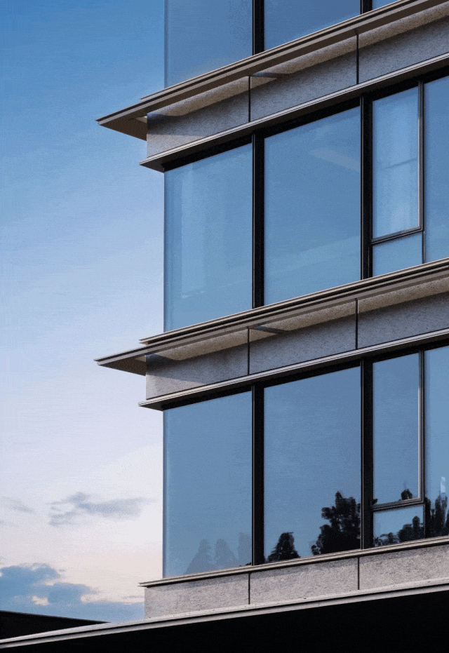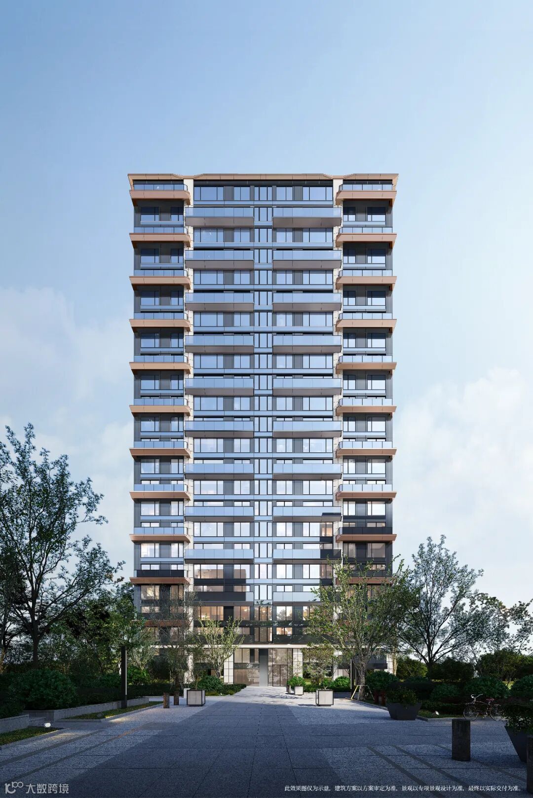 17层规制小高层低密住区公建化外立面,南向窗墙比约0.6,石材+铝板+玻璃门窗占比达到约98%,阳光、风景的自然诗意于室内尽情绵延。
