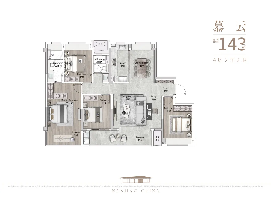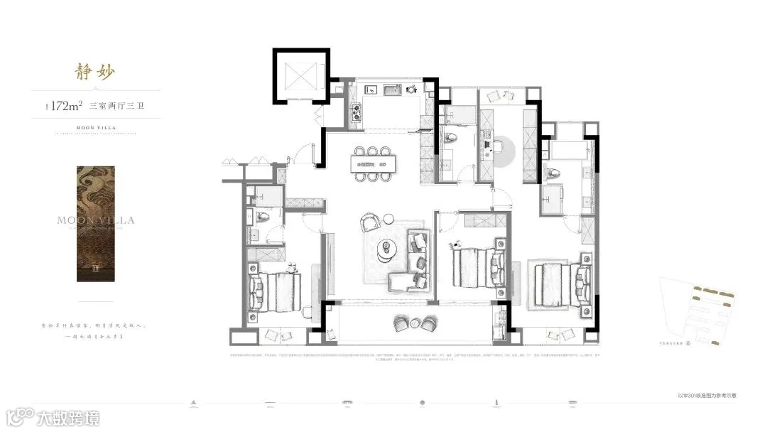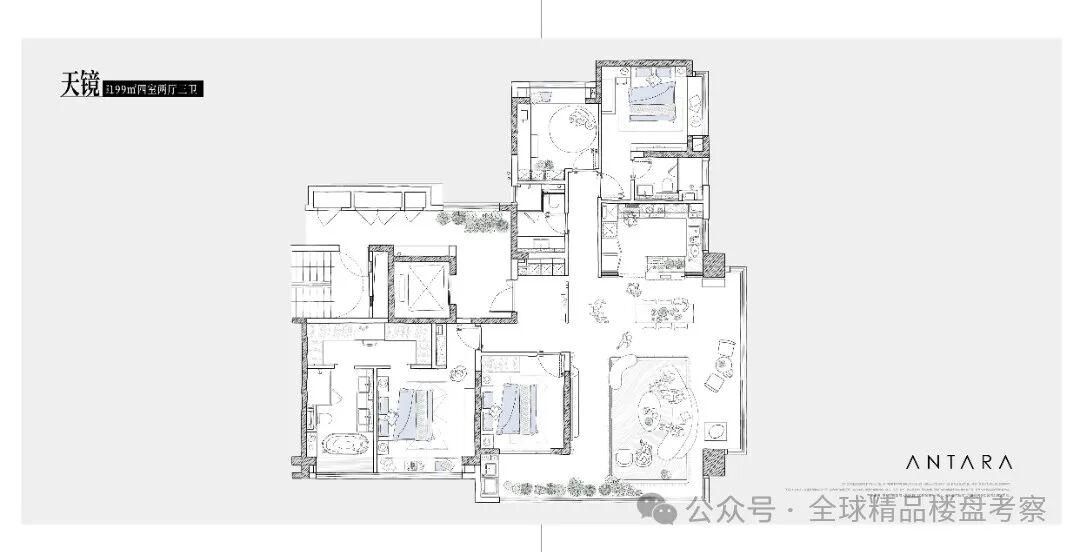 项目建面约320㎡,四房两厅四卫,层高约3.5米,得房率达到约83.5%。室内由梁志天担纲设计,为金陵月华带来同频世界的生活体验。