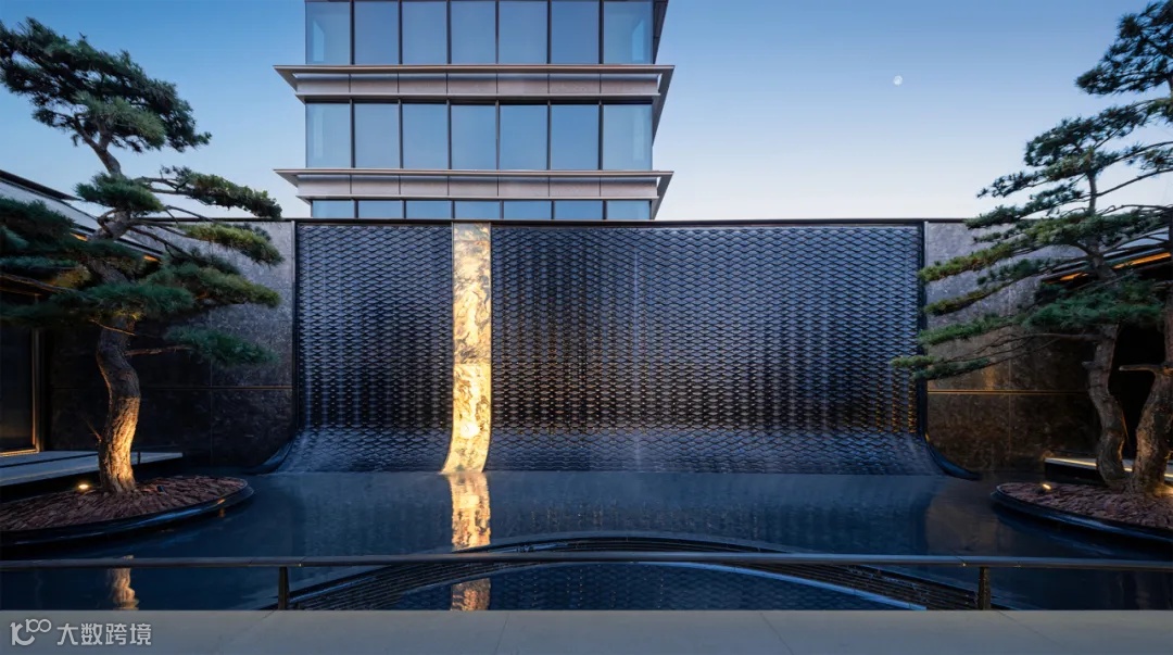 瞻月府的外立面一眼就惊艳,采用了进口葡米纯石材仿铜铝板整面玻璃打造,质感拉满。屋顶采用进口曼宁家深灰色陶瓦屋面,让建筑更加富有东方韵味。