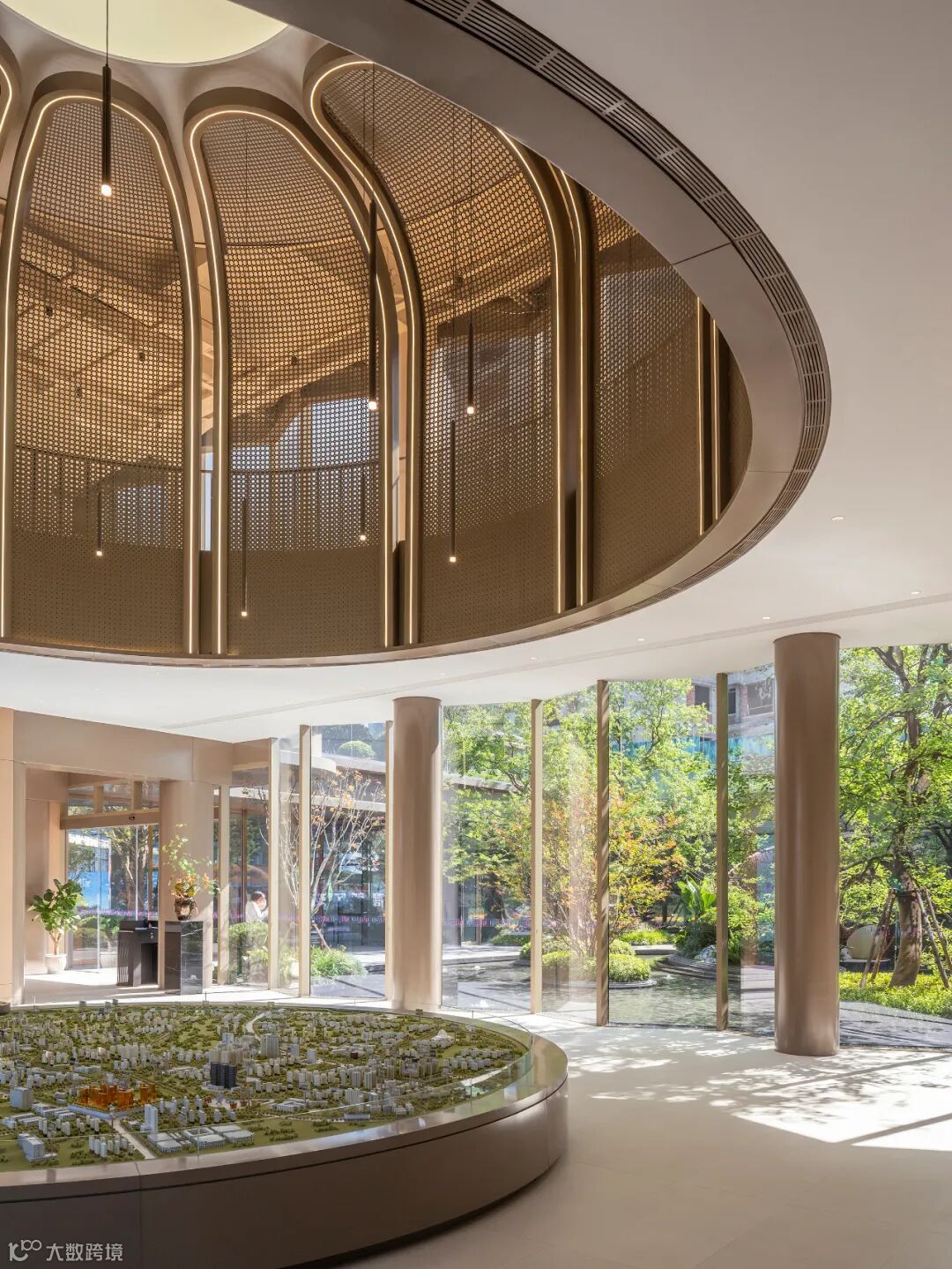建筑的室内布局是围绕庭院展开的、具有通用性的空间。前期的室内设计以示范区为主要功能,北侧的双层通高空间布置沙盘区,上方设置花瓣式穹顶天花,在兼具仪式感和精神性的同时,与松弛的庭院景观相得益彰。