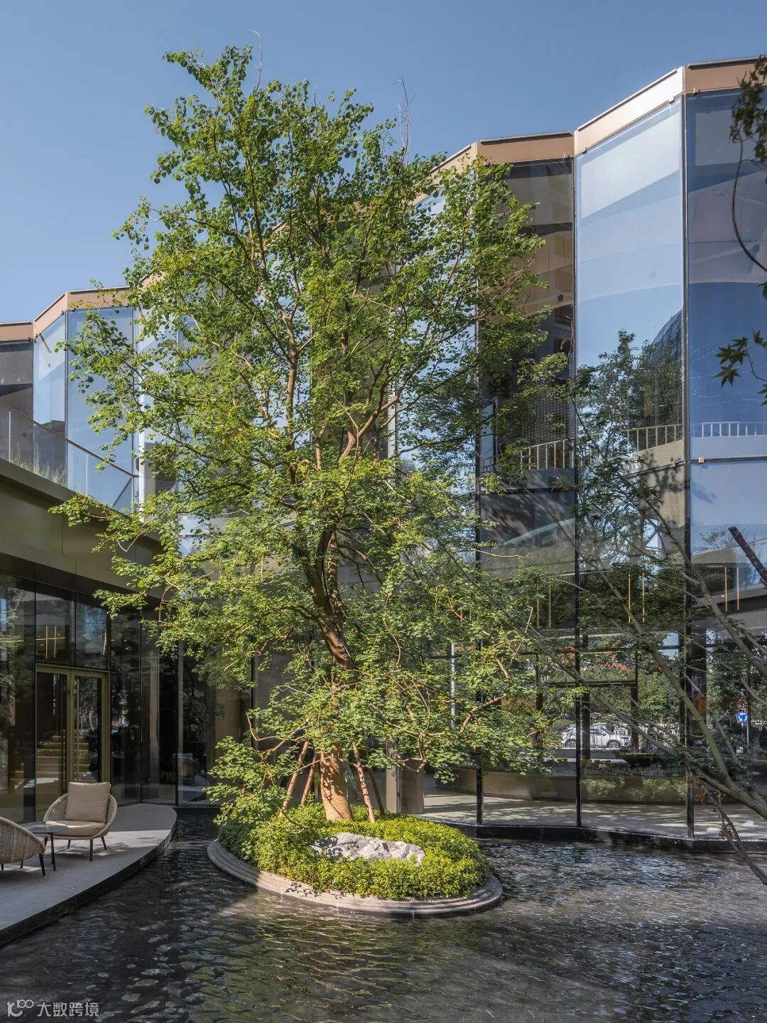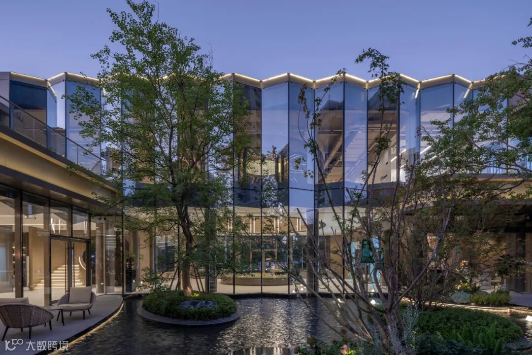 建筑庭院则以水池、灌木和茂盛的树木为主要元素,打造一个绿意盎然的景观核心,提升四周室内空间的品质。