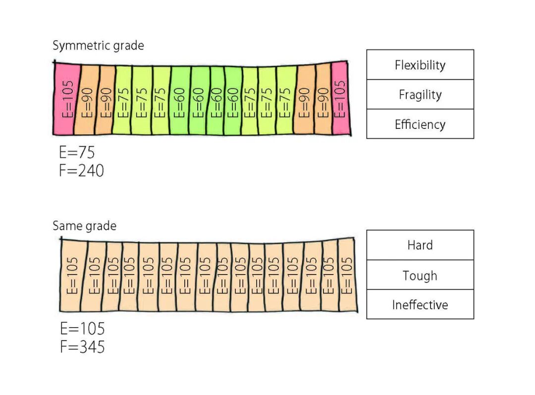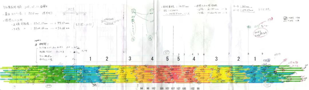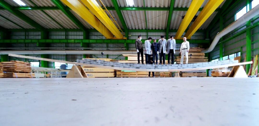 Precision wood / Designing lamina arrays for laminated timber - Young’s modulus of wood is determined by the average value obtained by destructive inspection of many similar materials or by a very rough grade test in the factory (classification according to strength). Even if they have the same trees and Young’s modulus since wood is alive, it has different properties and strengths, and the actual wood strength of each unique piece cannot be known without destructive testing. Therefore, unlike steel and RC, it is not possible to precisely predict the behavior of timber by structural calculation, so the design is made with a large safety factor. That idea has already been adopted from the laminated timber manufacturing plant. So, it was thought that if non-destructive strength tests were conducted on all the wood used, precise individual member strengths similar to steel frames and behaviors consistent with structural calculations could be obtained. In this plan, 12 “precision wood” pieces were manufactured by designing the arrangement of the lamina based on the individual data obtained by carrying the load test of about 1100 lamina.
