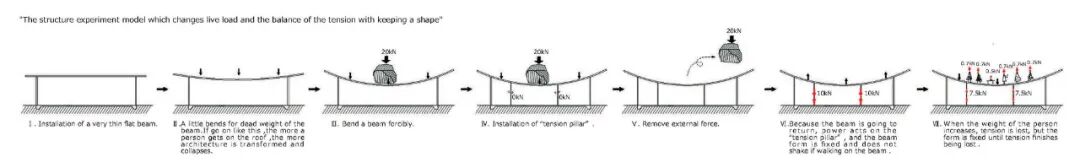 Changing stress on the curved roof and tension material - The more a person rides on the rooftop, the smaller the tension on the lower vertical pillar, and it is designed so that compression is not applied until a maximum of 150 people (40 kg / ㎡) is reached. The payload and tension keep the shape of the building while deducting from time to time.