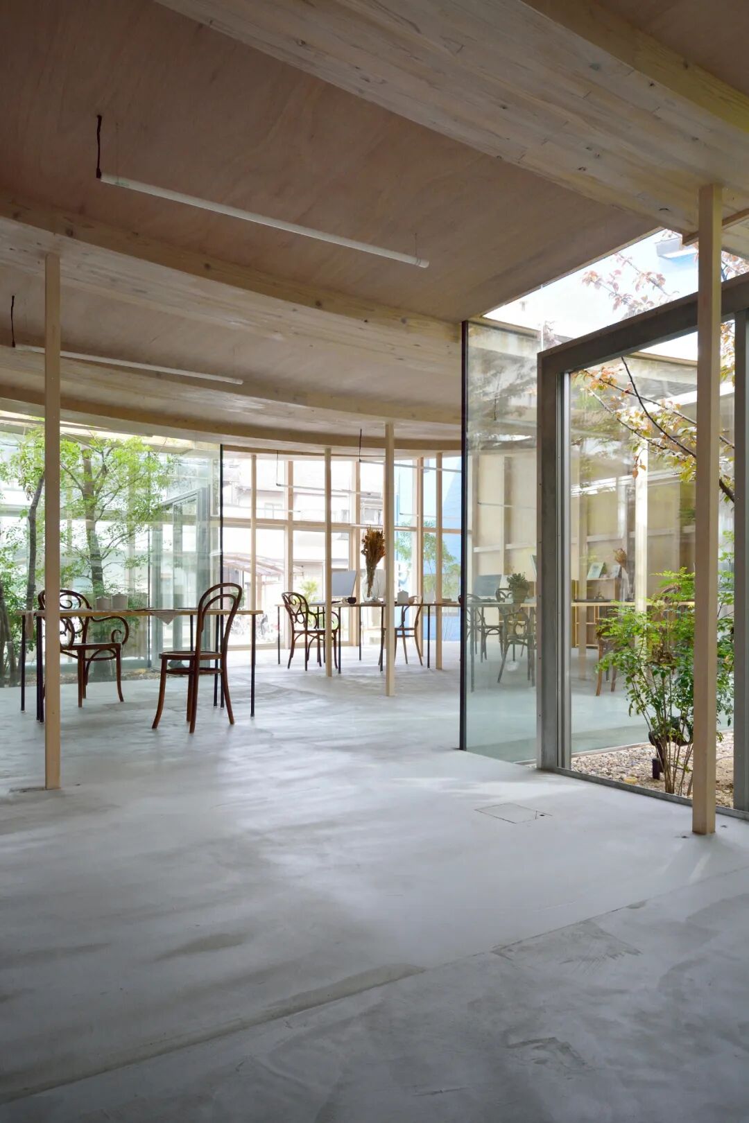 Wood tension material like extra-fine columns - To prevent the interior space from being overly dominated by structural principles, the tension material is Hinoki rather than wire. This has created a wooden structure that is not much different from usual, except for the curved and very flat beams where the proportions of the pillars do not support the roof.