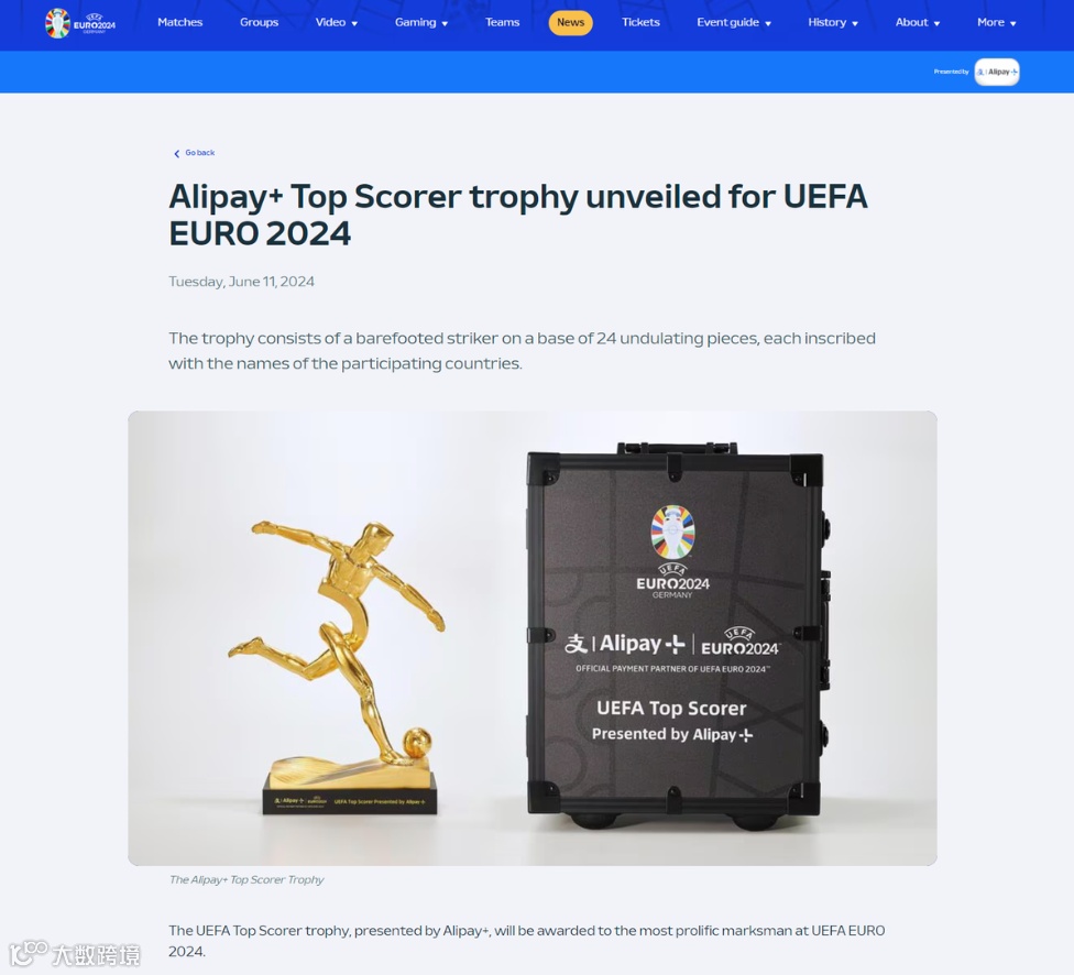 6月11日,欧足联官方发布了2024欧洲杯“支付宝得分王奖杯”,奖杯将在赛事结束后,颁发给今年欧洲杯决赛阶段进球最多的球员。