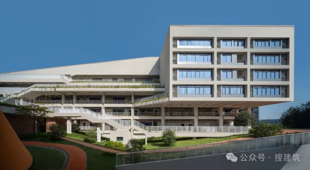 The Qingquan Foreign Language Junior School in Longhua District, Shenzhen, is a 24-class junior school with a total building area of approximately 29,266 square meters, located in Qingquan Street. The design team has prioritized natural attributes in the campus layout, creating dynamic spaces that alleviate students' learning pressures and promote their well-being in an environment rich with sunlight and natural beauty.