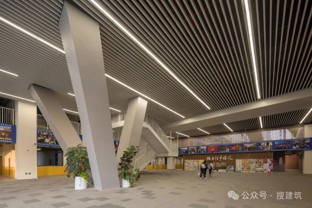 The school's original plot, an irregular trapezoid with a land area of 14,589.7 square meters, features a terrain with a maximum height difference of 7.1 meters. To optimize the use of space, two six-story teaching buildings are strategically placed along the perimeter of the land use line, with the ground floor elevated to enhance the openness of the first-floor view. An aerial library connects the teaching functions, and continuous rooftop gardens are created through building setbacks, forming a "valley garden" that serves as a central focal point.