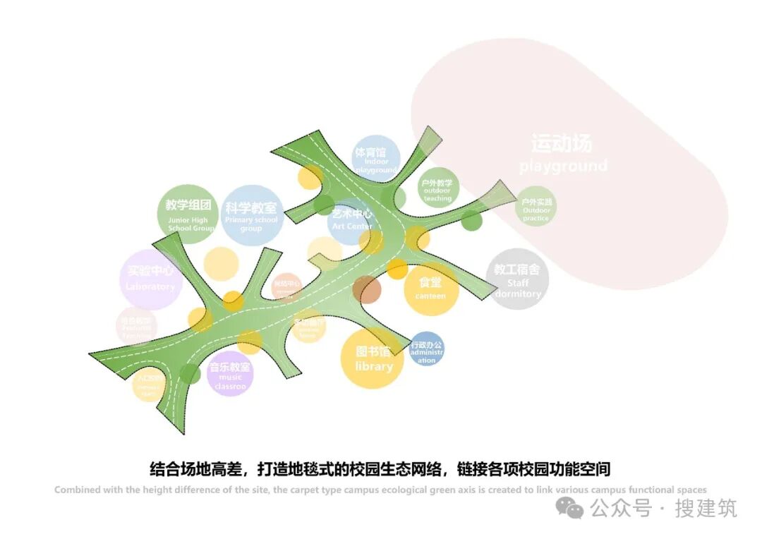 运动场地被抬高以延伸山谷花园,从而扩大了儿童运动场地的面积,并纳入了一个在恶劣天气下使用的体育馆。礼堂的入口巧妙地隐藏在一个洞穴状的结构中,以儿童友好的方式重新诠释了“另一个世界”的概念。校园设有绿色天空观景台、空中步道、丰富的多功能空间,形成了地毯式的校园生态网络。