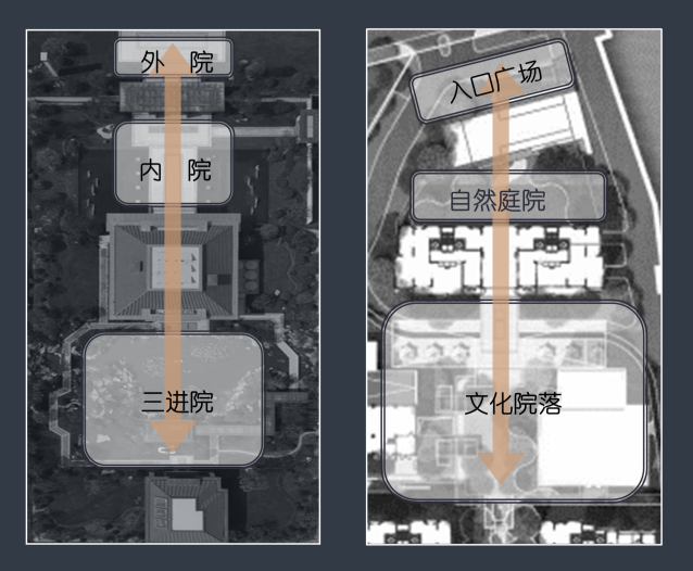在区的布局中,设计师借鉴了中国园林和传统民宅中的层级和层层递进的理念住。入口广场、社区中庭与私密庭院体现了由公共到私密空间的层级递进。入口处的广场类似于园林中的“外院”,穿过绿荫掩映的自然庭院,逐渐进入居住楼栋周边的小型景观区域,如同园林中的“内院”,最终到达私密的单元入口空间。