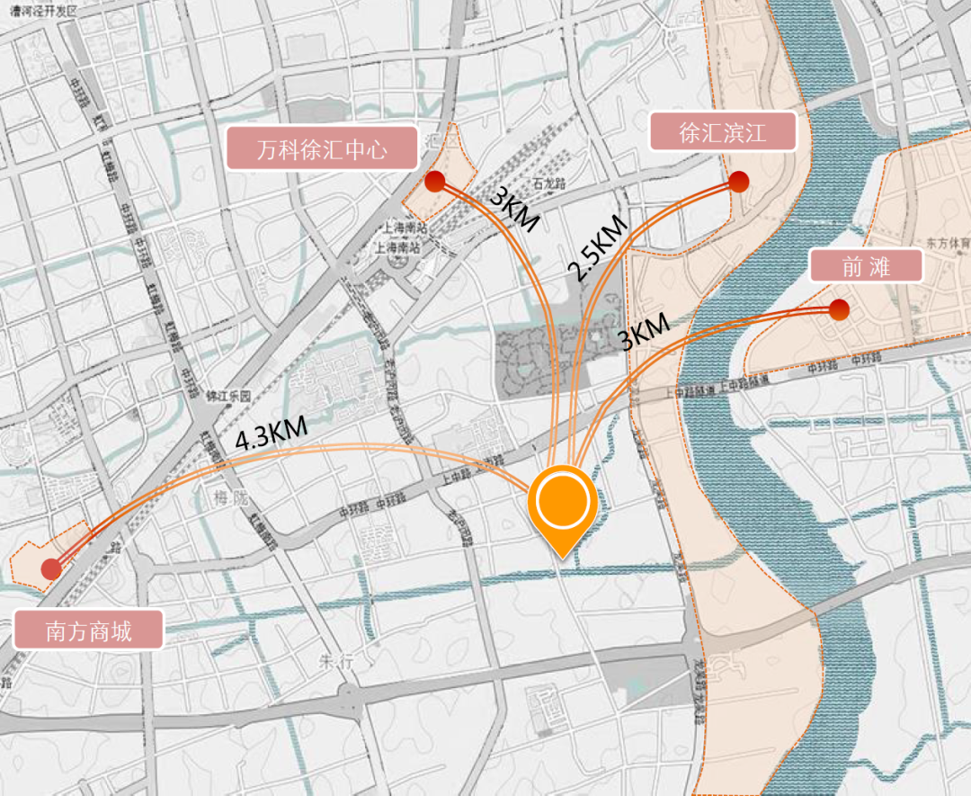 地块为城市繁华地段,距离前滩CBD直线距离仅3km,隔江相望,区域价值不断攀升,成长潜力较大。基地还紧邻徐汇滨江板块,依托其高端服务,给予了项目未来的价值支撑。