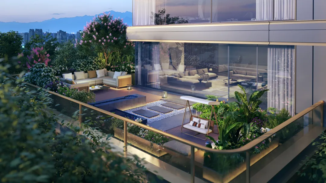 项目突破传统单层客厅的桎梏,通过约6.6米挑高墅厅设计,让空间向高处延伸;户户享有约20-30㎡空中露台,实现“有天有地有院子”的生活。