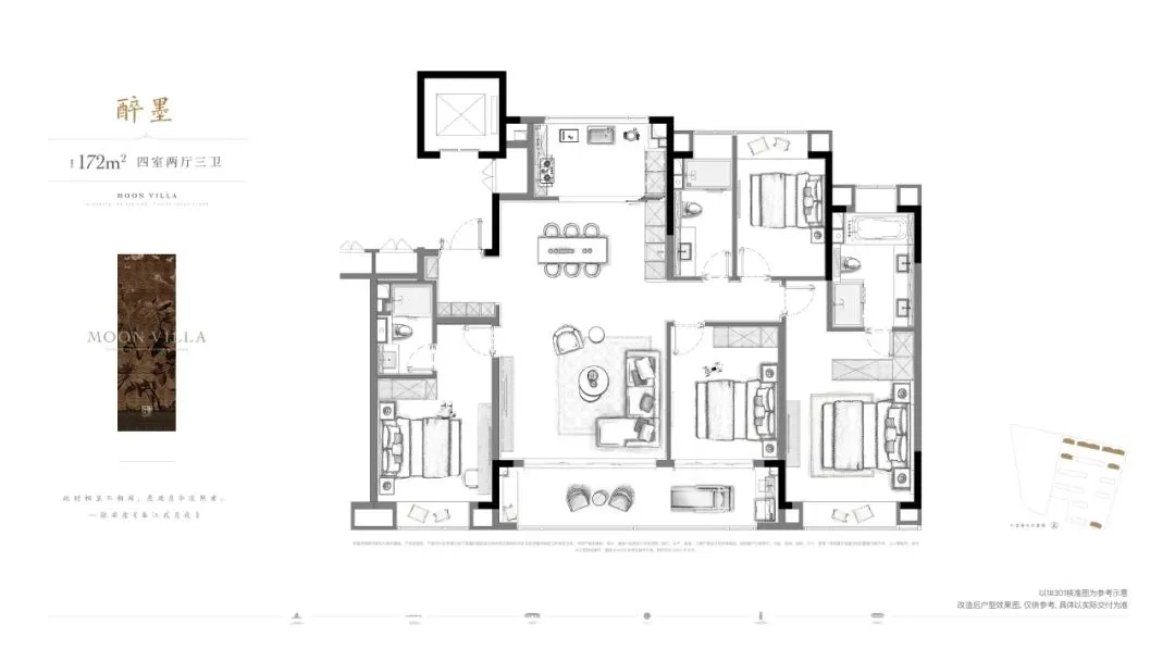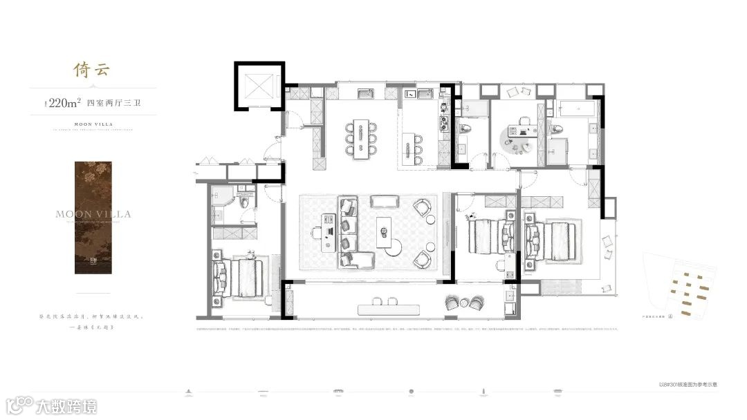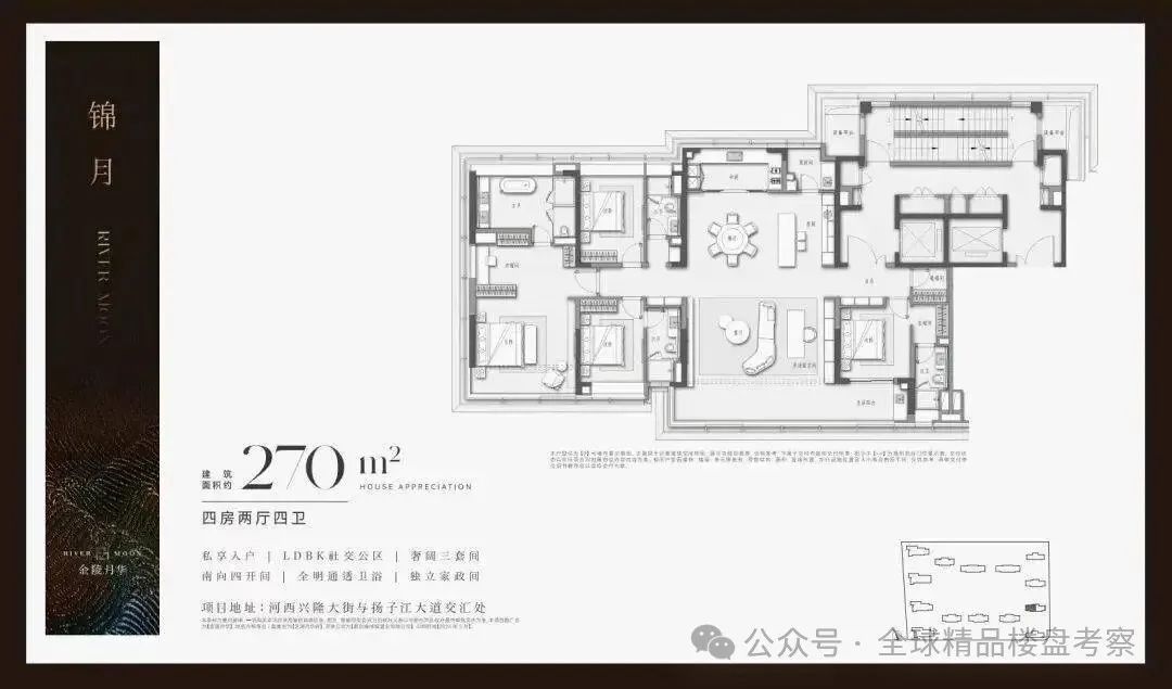 项目建面约320㎡,四房两厅四卫,层高约3.5米,得房率达到约83.5%。室内由梁志天担纲设计,为金陵月华带来同频世界的生活体验。