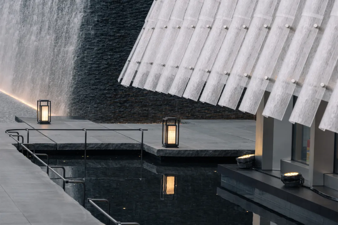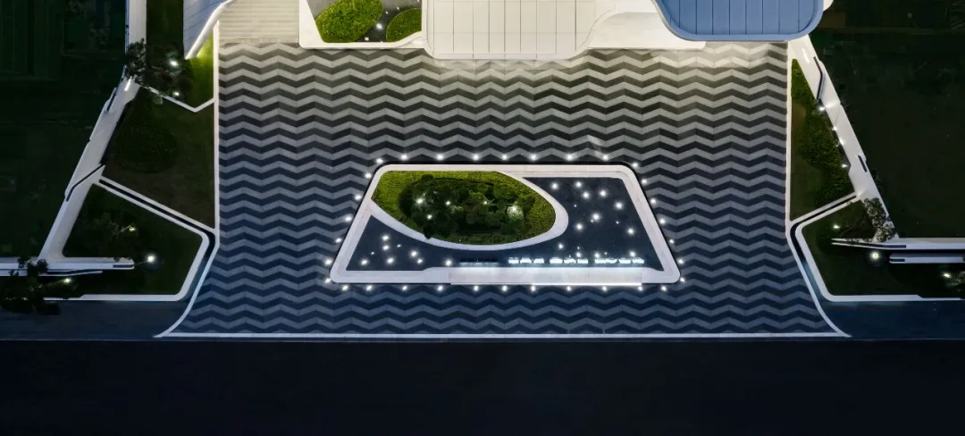 池底采用光面蓝钻的进口天然石材,在太阳的照射下闪闪发光,犹如在池底铺满了砖石,赋予约245㎡中心水景巧夺天工的妙趣,结合松树、LOGO所带来的光影,打造了一处美轮美奂的水中岛屿美景。