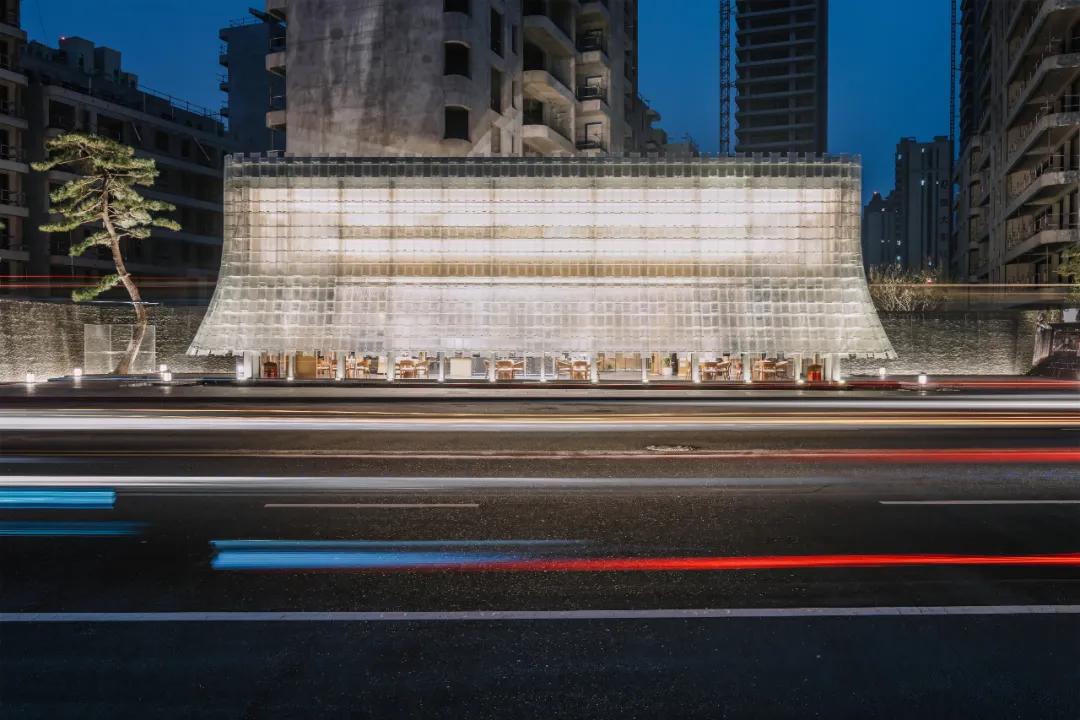 玉门内部,内藏精致木构,通过艺术形体重构一个木构建筑,营造出一个内有乾坤的空间体验。大堂包括长桌等候区、大堂服务区,灯光从木构缝隙中渗透出来,中心区域设置通高灯箱,加强大堂的仪式体验。