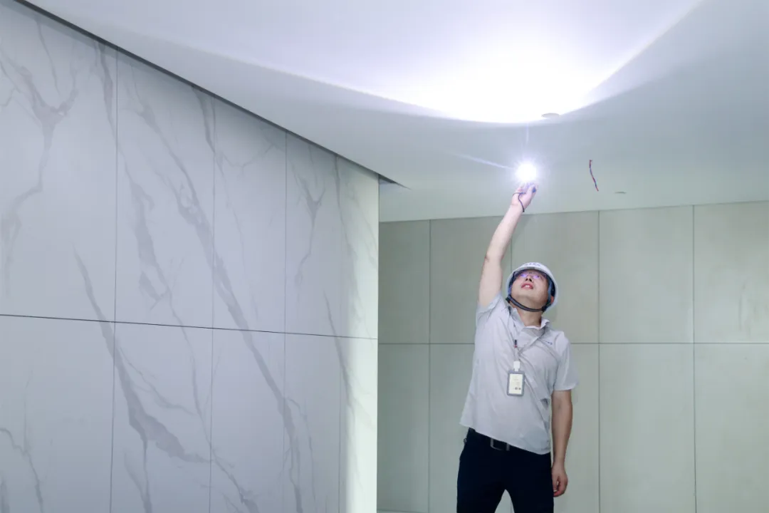 看得见的地方难,看不见的地方更难。在商丘金沙壹号院的入户大堂,每一个管线的位置,每一根方管的距离,那跟用尺子量出来的一个样。