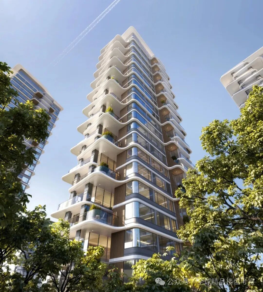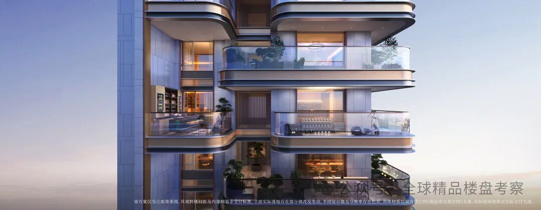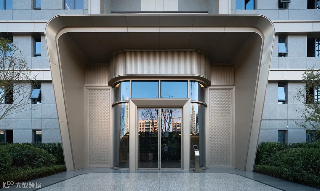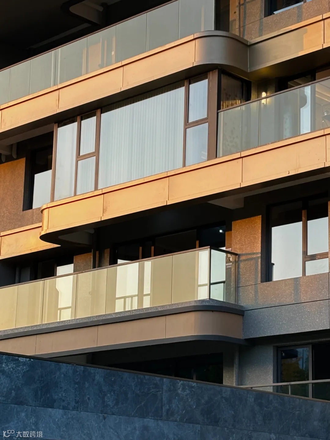 整体建筑形体采用极简的设计语言,强调舒展的横线线条,运用了转角、切割、圆弧等复杂的程序,颠覆传统住宅立面的平铺直叙,玻璃、曲线铝板线条组成灵动的转角阳台,在统一的序列中寻找自然的律动与和谐。