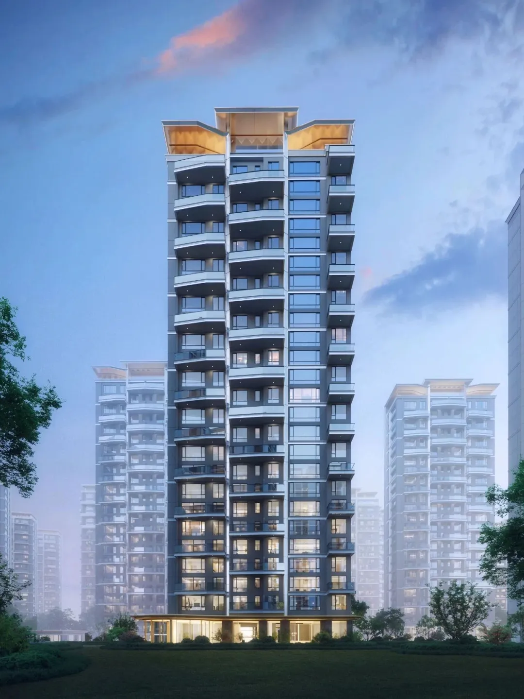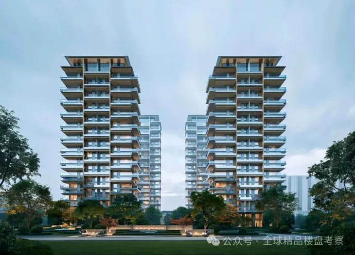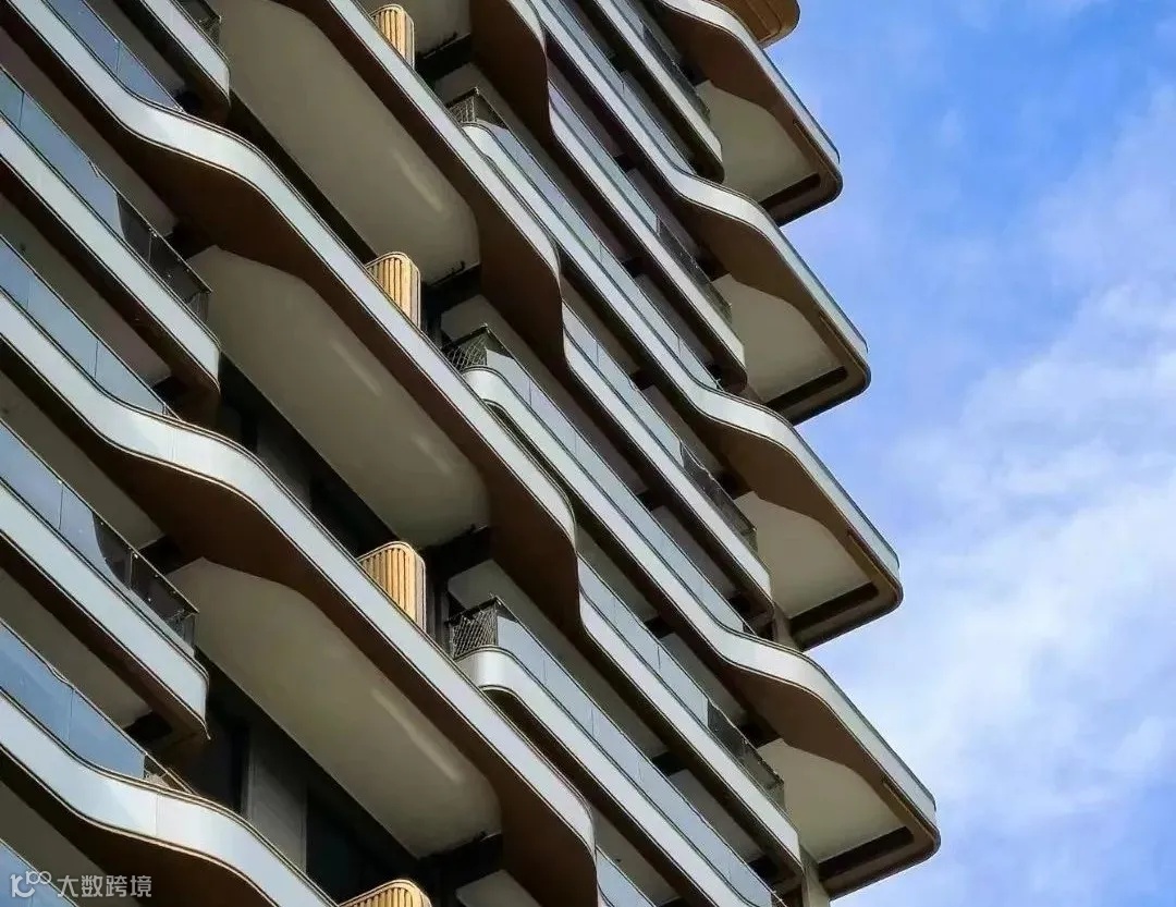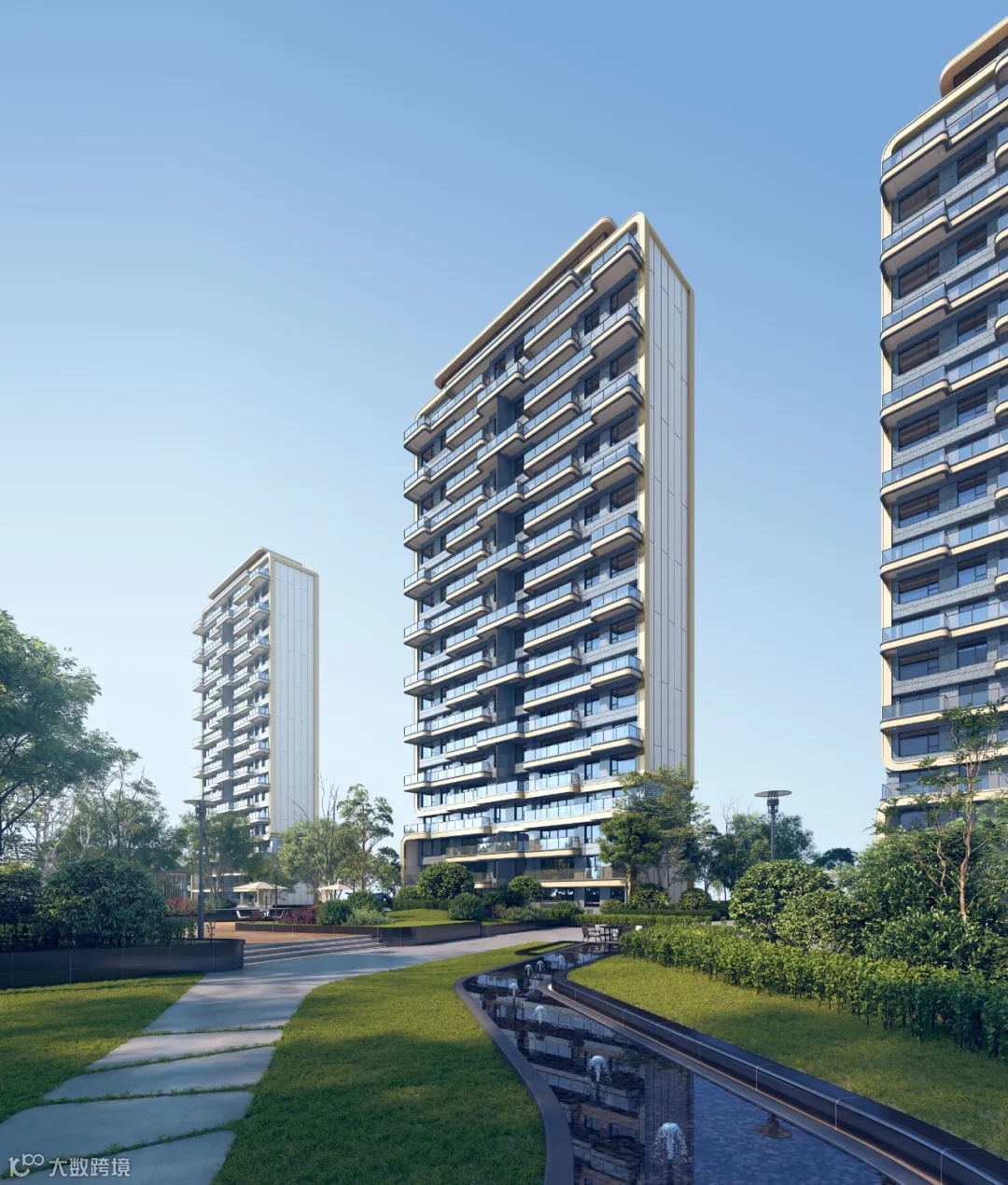 整体建筑形体采用极简的设计语言,强调舒展的横线线条,运用了转角、切割、圆弧等复杂的程序,颠覆传统住宅立面的平铺直叙,玻璃、曲线铝板线条组成灵动的转角阳台,在统一的序列中寻找自然的律动与和谐。