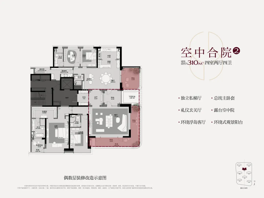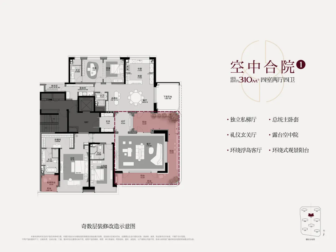 建面约310㎡四室两厅四卫户型,视觉冲击力满满,创新环绕式浮岛客厅,让客厅犹如空中浮岛般,奢享极致观景体验与空间享受。