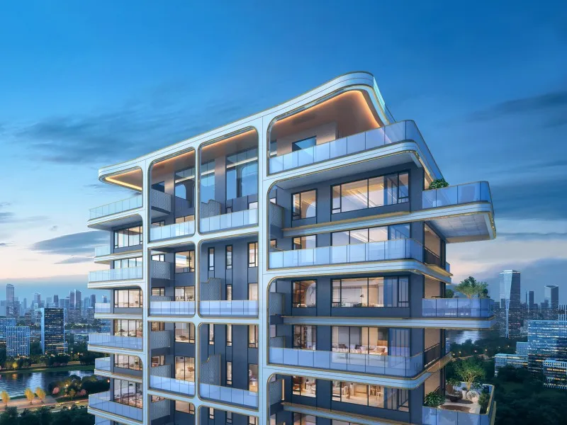 立面设计上汲取河湖园的灵感,以“后现代主义”手法,将游艇与帆船的非对称流线型设计手法运用到挑檐的设计上,每栋楼仿佛航行在水面上的一艘艘游艇,既回应了“缦生活”/“度假社区”的项目定位,也彰显出了项目的尊贵气质。