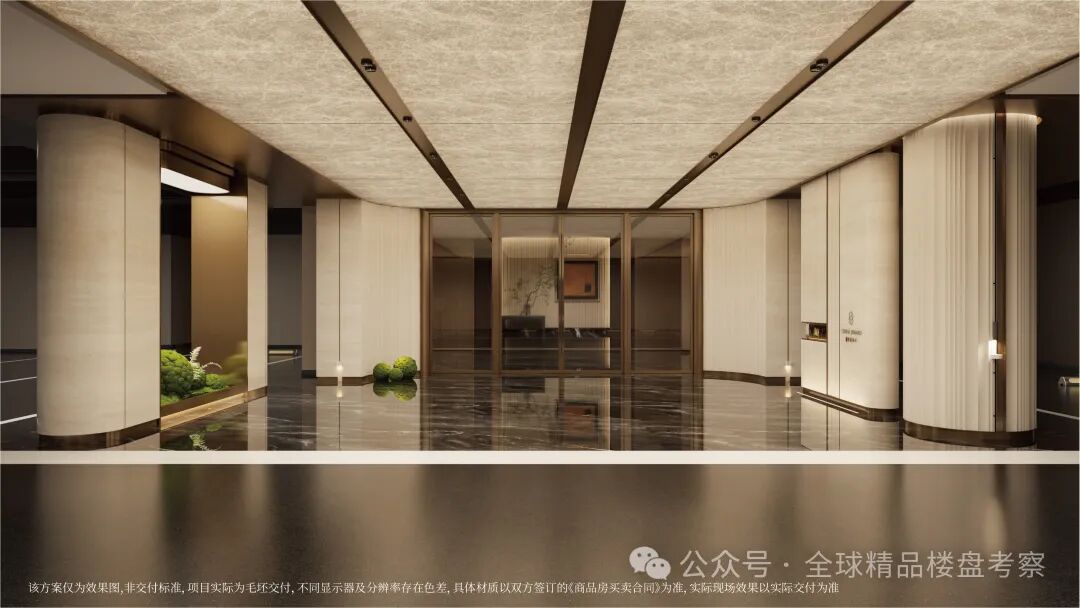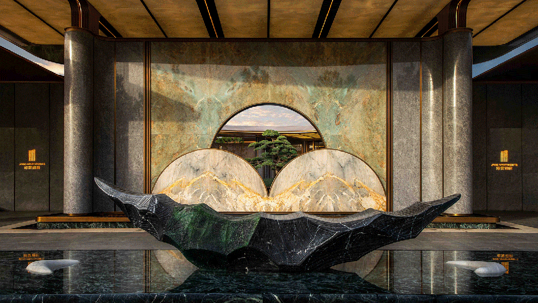 酒店式入口庭院,环岛式落客营造隐奢氛围,昭示仪式感和尊贵感,大理石与迎客松,构成一幅立体的山水画。