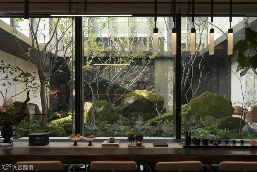 会所打造下沉式浮光溪谷花园,四个独立花园与会所泳池、茶室、酒廊等功能空间自然衔接,红枫留韵,苔痕写意,精心雕琢每个景观,在自然的滋养中感受东方禅意。