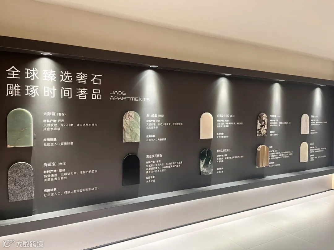 项目甄选奢石方案,大门入眼便是普拉达绿、亚马逊蓝、海蓝宝、天际蓝等奢石,还有大门两侧采用的南宋建州窑工艺陶板,经过高温烧制造型,再进风雨连廊之中,还有普拉达绿奢石托起的“悬浮松院”......