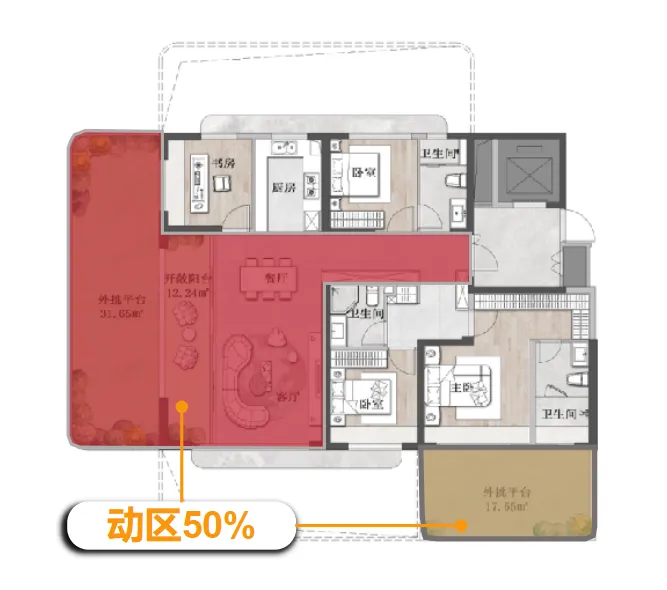 以错层露台创新设计,实现户户空中庭院。创新露台(不计容)、阳台(半计容),观景视野、采光尺度更优越,针对社交性极强的室内公厅,采用LDKB设计构建多样生活场景。
