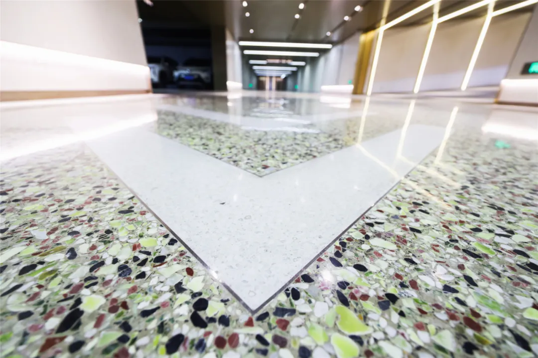 由于地下车库流量大、磨损大,金沙在原有水磨石地坪基础上,升级全新配色方案。水磨石地坪具有防尘防滑、亮度高、耐老化、耐污染、耐腐蚀等优异品质,让地坪使用寿命更长。
