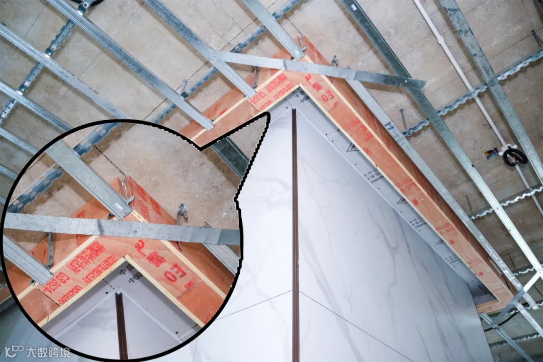对金沙来说,横平竖直那都只能算基本功,下面这个可就是"别有用心"了。下图这个叫"7字拐",就是在拐角的地方用一整块木板切割出"7字"形状,另外还加装了斜拉撑,这样的设计能让吊顶寿命耐久度更长,防止老化断层开裂。