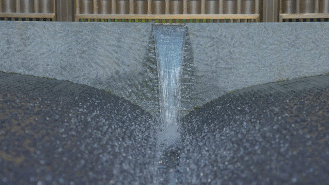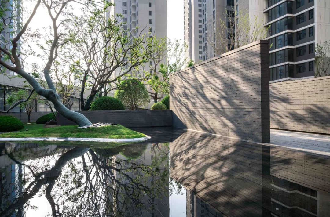池底采用光面蓝钻的进口天然石材,在太阳的照射下闪闪发光,犹如在池底铺满了砖石,赋予约245㎡中心水景巧夺天工的妙趣,结合松树、LOGO所带来的光影,打造了一处美轮美奂的水中岛屿美景。