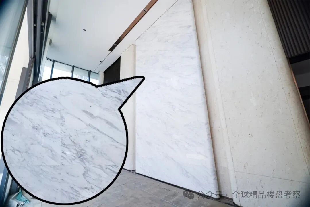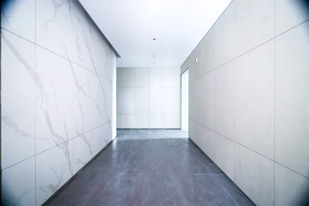 其实公区装修,最难的部分就是连纹砖对纹。大家仔细看左边的墙面,全都是带纹路的,工人铺贴每一块瓷砖的时候,那都是严格按照编号施工的。