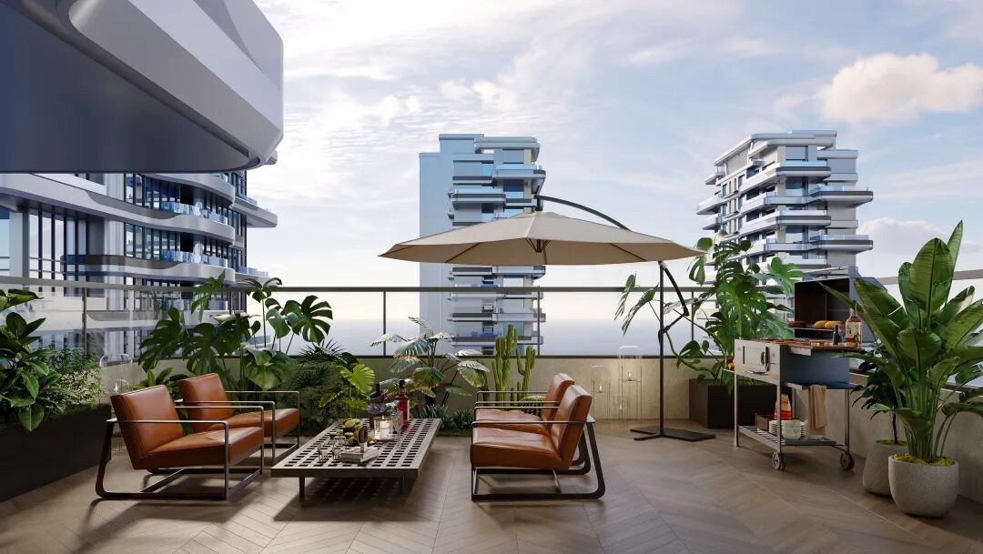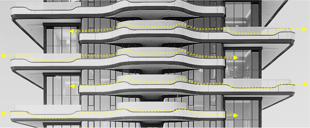 灰+白色的建筑底图与空中绿化系统交相辉映,流动的曲线与错动的花园不仅为城市增添了浪漫的风情感,更是建筑设计对一座滨海城市印象的回应。