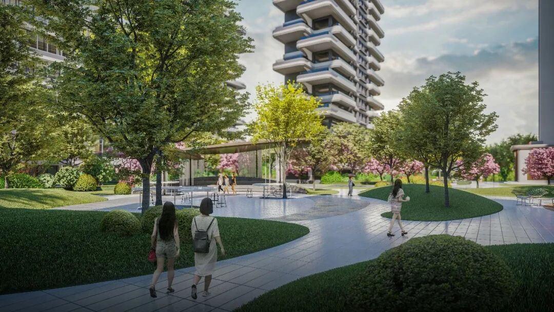 在楼王底部首层设置架空层,链接各个庭院景观,形成超大尺度的中心景观花园,创造多维度的生态居住体验,打破固有楼宇之间的界限。