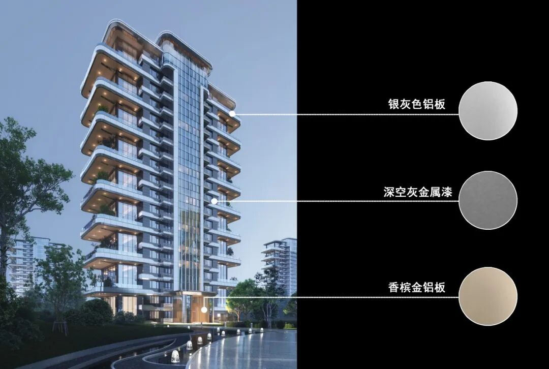 立面采用银灰色铝板和深空灰金属漆,局部细节刻画采用香槟金铝板,提升豪宅的尊贵感。同时用暖色的金属融合冷色调铝板的冰冷感,提升社区的人情味。