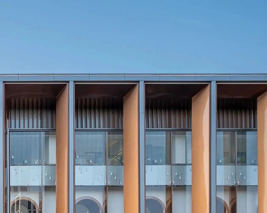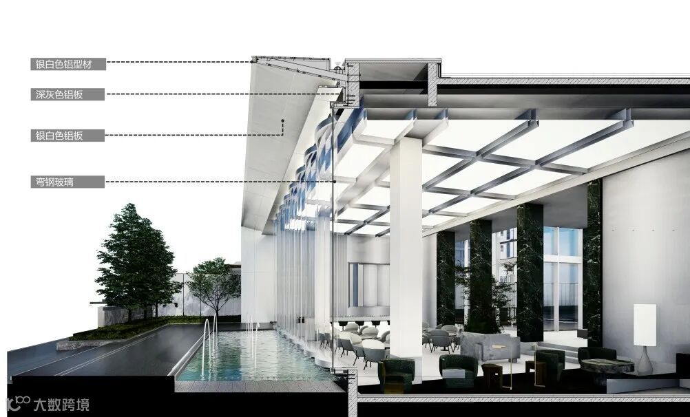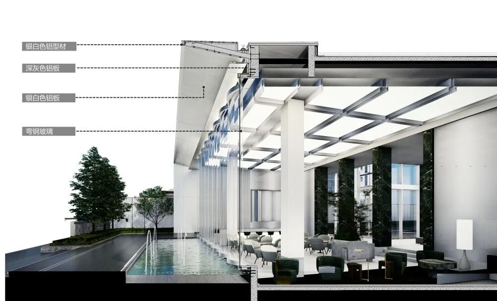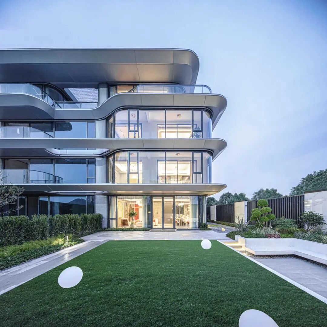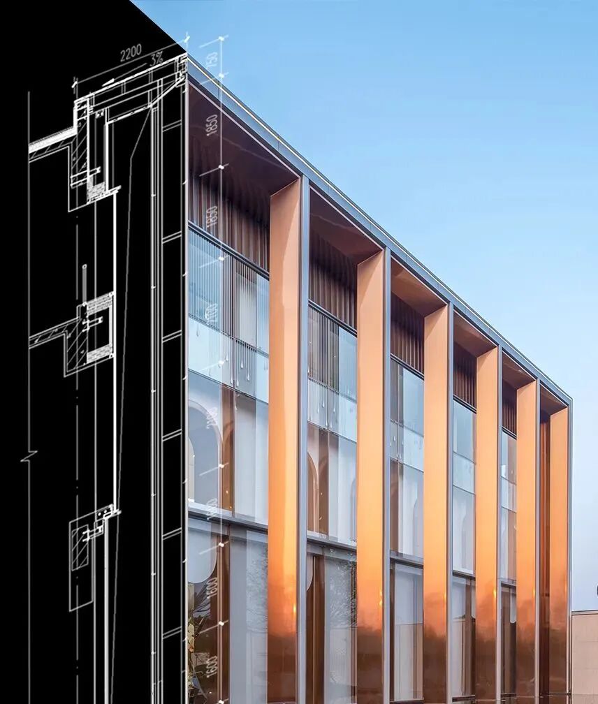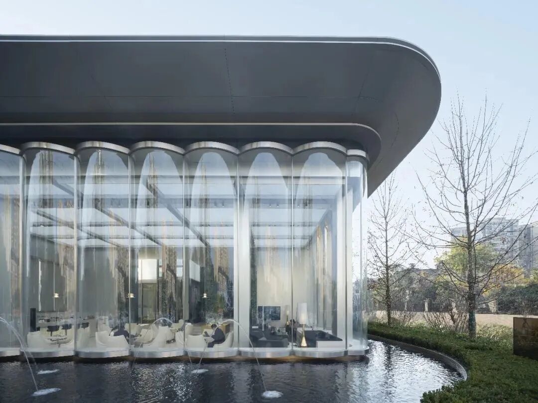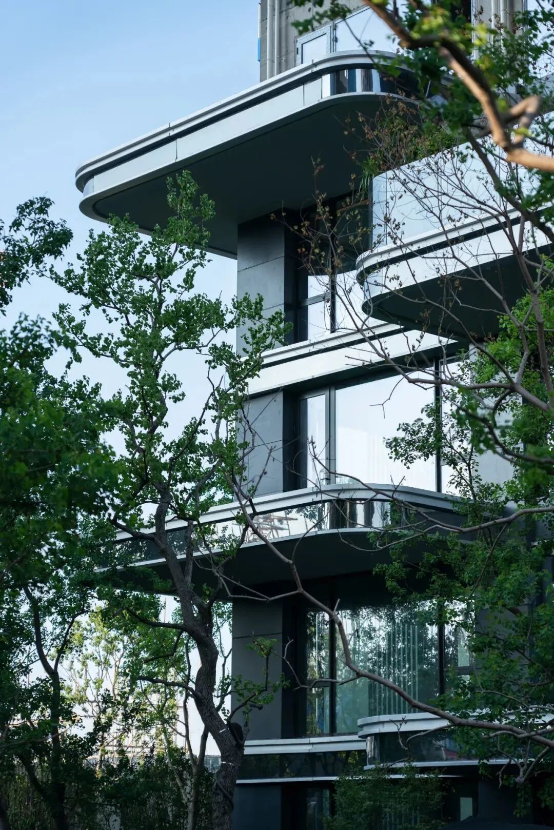 转角处定制曲面落地玻璃的使用,在使整体立面形态更加完整流畅的同时也为室内带来绝佳的视野,由于其工艺要求较高,每单块曲面玻璃需要至少20天的生产周期,其成本造价约是普通同尺寸玻璃的1.5倍。