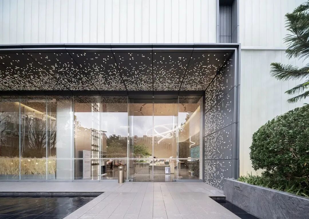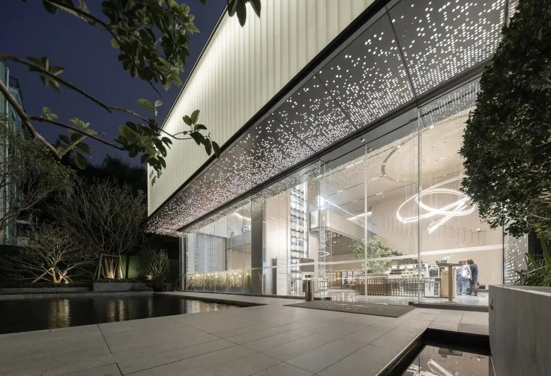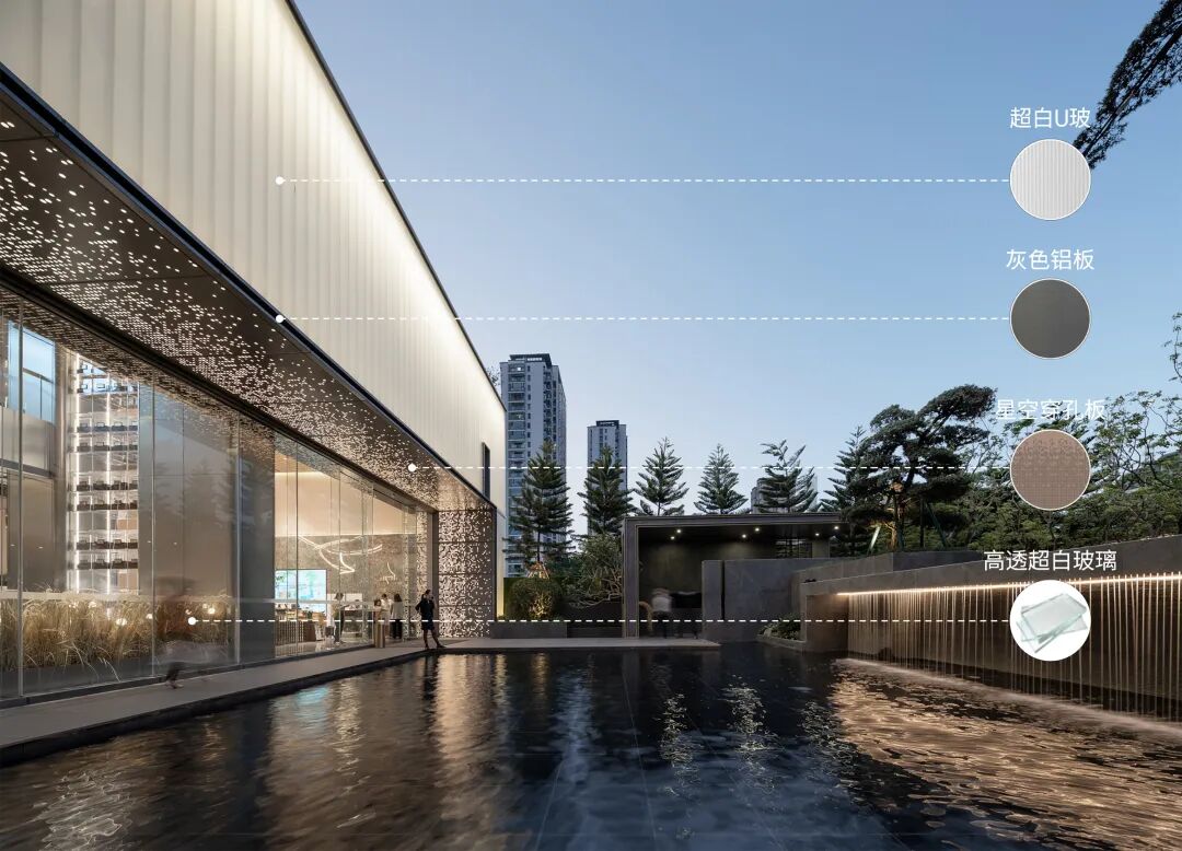 示范区,保利·锦上售楼处立面采用U玻+星空穿孔板+超白玻的组合,U玻筑起的堡垒在夜晚发出温润的光,为住户指引归家的路,随着每块星空穿孔板的变幻,溢出的光线流转不定,撩人心弦。