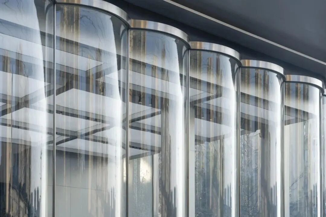 其光滑的流线型实现了从平面幕墙到弧面玻璃幕墙的完美过渡,使玻璃幕墙运用于建筑更具圆滑平整,自然良好的整体感。