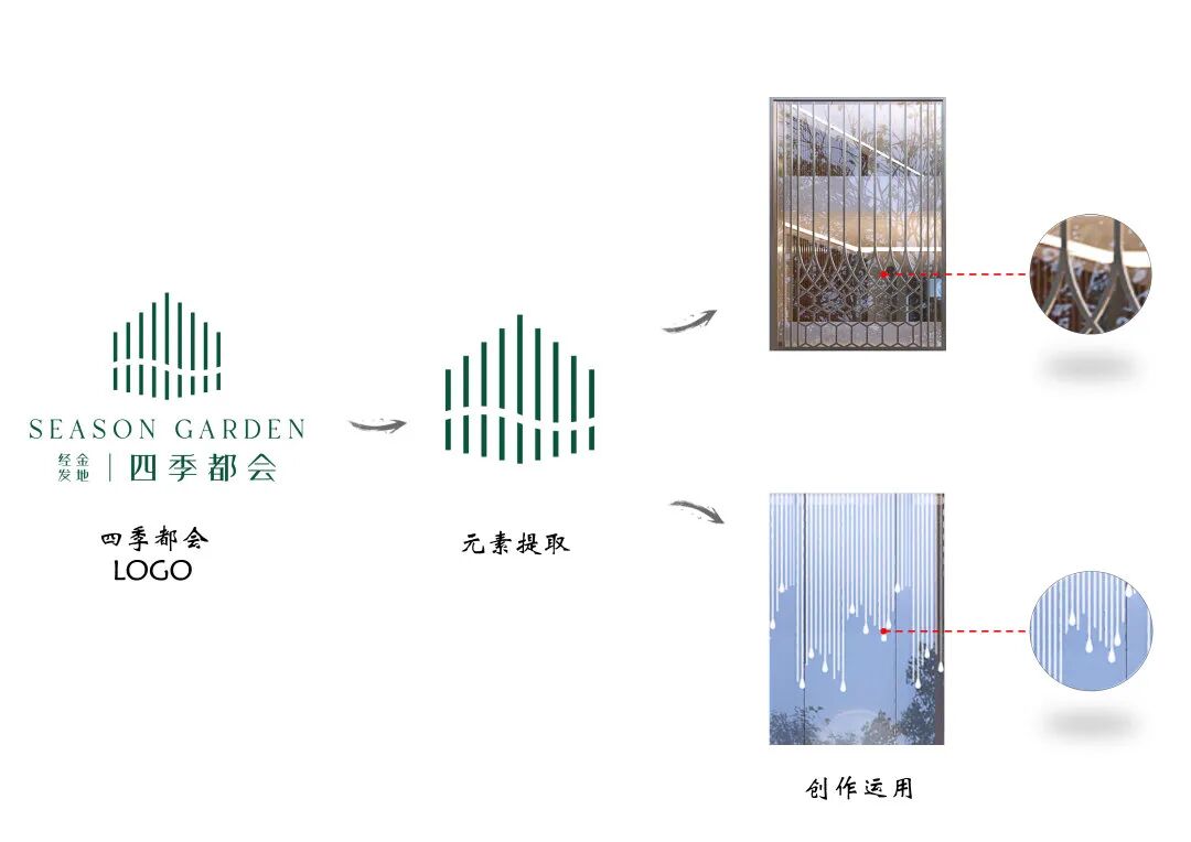 针对玻璃幕墙设计师进行了细节上的精心研究,设计提取四季都会的LOGO在彩釉玻璃上演化为垂坠的玻璃泪,对LOGO的韵律感进行提取融合,丰富了视觉效果,营造出精致活泼的空间感。