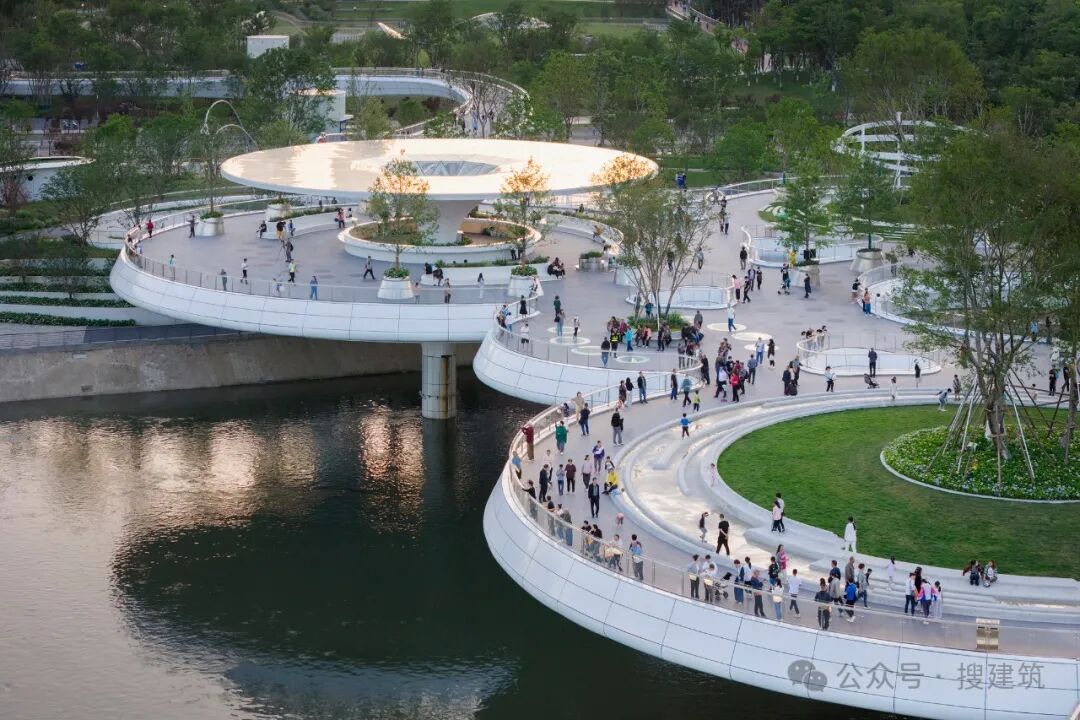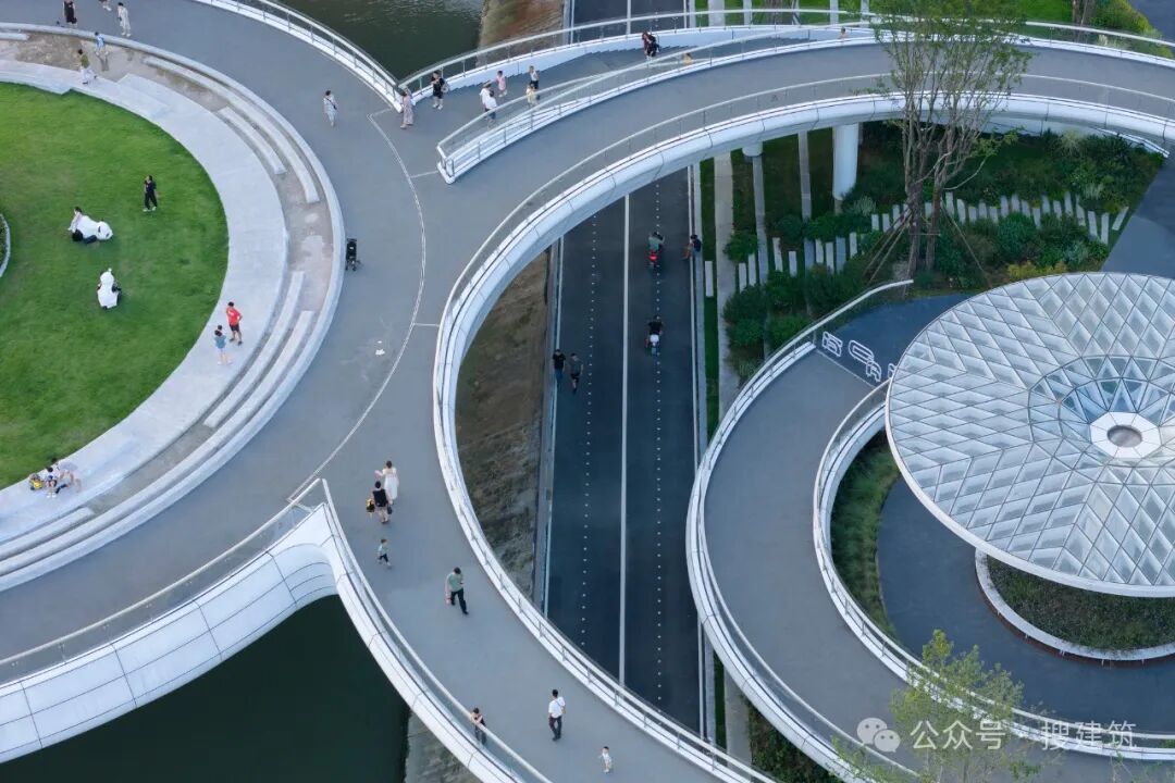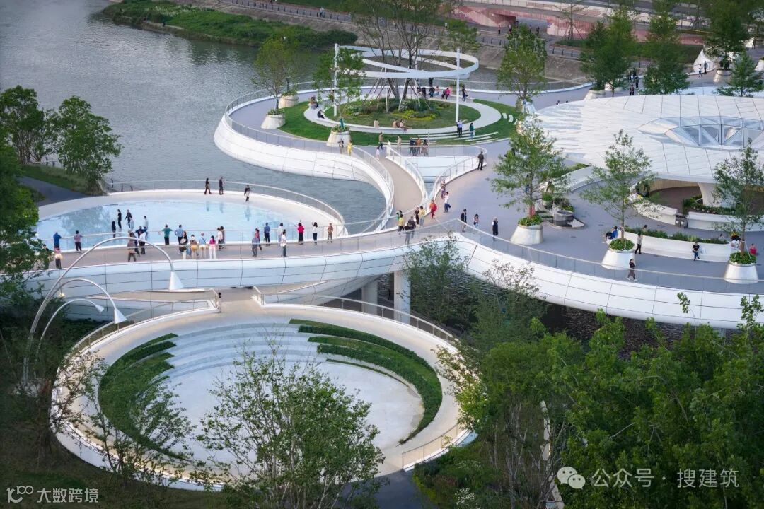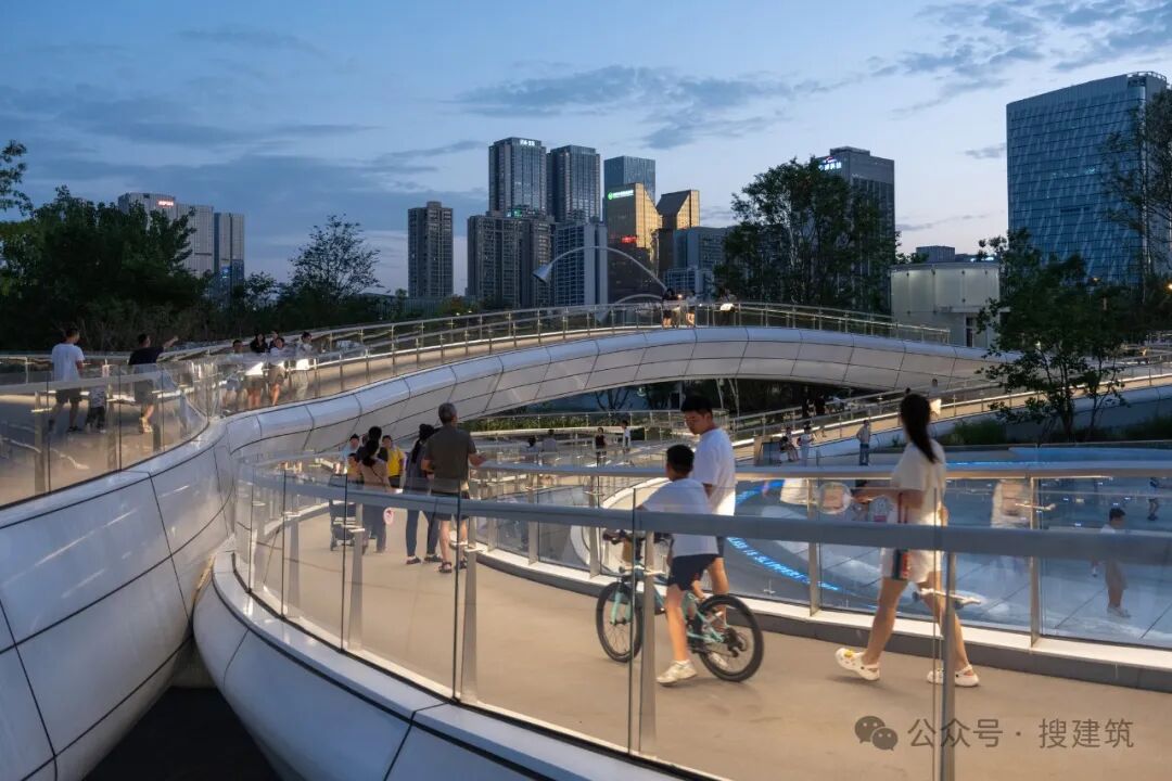 A floating park - How should this pedestrian bridge in Chengdu Jiaozi Park Financial and Business District cross the Jinjiang River? Should it be positioned as a bridge or a park? In the process of design, such questions were continuously put forward. Based on the city's urban structure, the Jinjiang River runs from north to south, dividing the financial and business district into two elongated blocks, one on the eastern side and one on the western side. The 2.5-kilometer east-west green belt is split into two parts by the Jinjiang River, becoming two parks facing each other across the river. The intersection of the Jinjiang River and the green belt on the central axis is a natural breakpoint in the urban space and needs to be bridged. Building a pedestrian bridge can not only connect the blocks on both banks, enabling a smooth walkway system but also link the two parts of the green belt, thereby achieving the integration of the river and green belt.