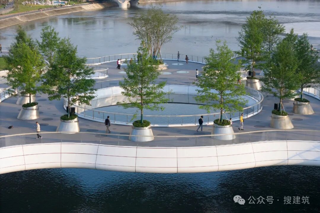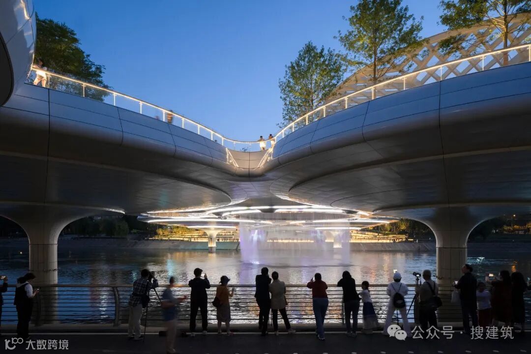 Chengdu, known for its inclusive and laid-back lifestyle, welcomes tourists at any time. The nine discs not only form a complete whole but also offer nine relatively independent activity scenes. The water bar beneath the lotus-leaf pavilion offers a setting to enjoy the scenery while sipping a glass of wine, creating an impressive experience. The 24-hour unmanned library provides a space for reading for nearby residents. The circular theater, constructed according to the varying heights of the river banks, is a venue dedicated to outdoor performances. The fantastic water show features fountains and colorful glass displays, creating a colorful fairyland for children to play. In the water garden, children can participate in a variety of activities centered around the water, enjoying diverse visual, auditory, and tactile experiences. The middle section of the bridge deck is hollowed out into a ring, creating an ideal spot to overlook the river from within the opening. The water curtain is designed around the ring, where a light show is held at night, making it a hot spot for citizens to take photos.