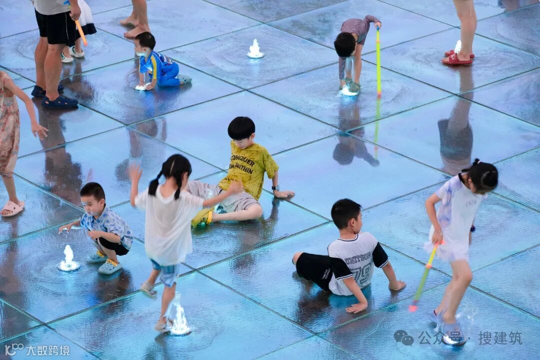 戏水花园,孩子们或躺或坐,绕水而逐,提供了与水“视、听、触”的多重体验。中段的桥面镂空成环,方便人们趴在洞口俯瞰河面。围绕圆环布置水帘,夜间开启光影秀,成为市民拍照打卡的热点。