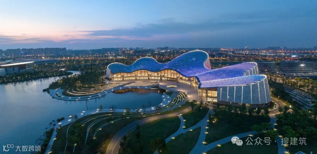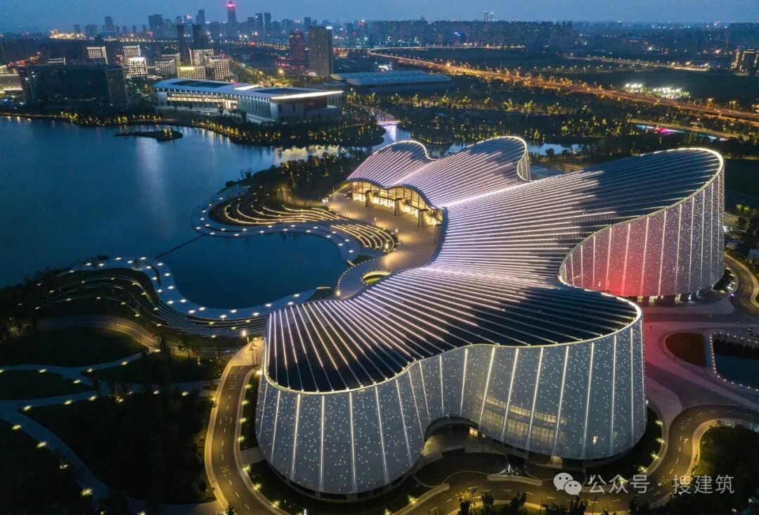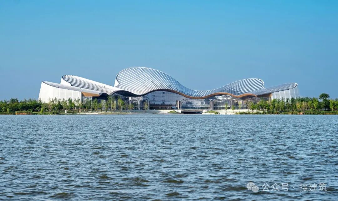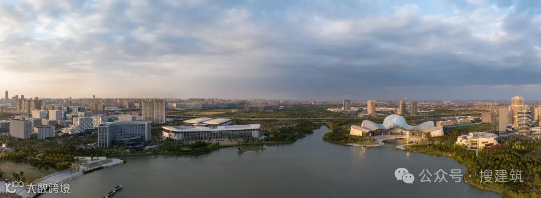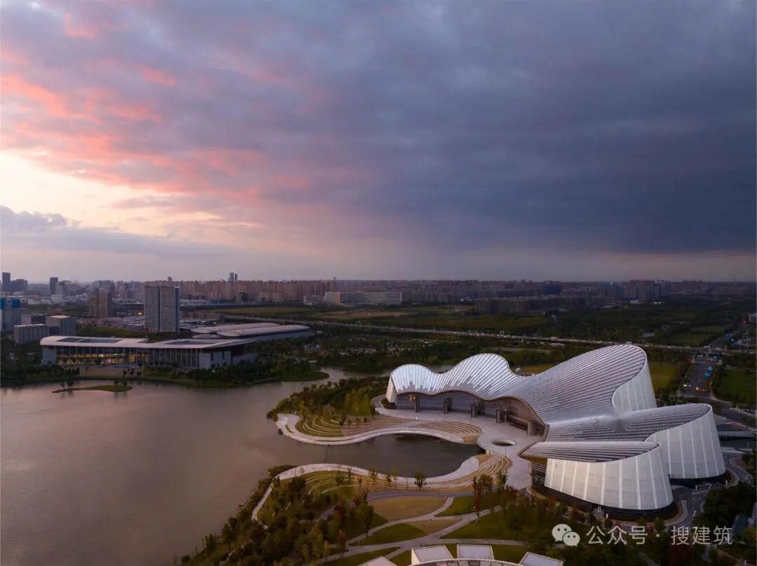 南通古称“通州”,以其“地据江海之会,通达吴越之路”而得名。是连接吴越地区的重要交通枢纽。南通大剧院周围的水体和城市边界空间是南通地理和历史意义的缩影。剧院位于南通市崇川区紫浪湖东北岸。南接南通美术馆,西接南通国际会展中心,构成南通中央创新区文化会展区。南通中央创新区三大公共建筑的组合在紫琅湖畔打造了一片对市民开放的公共空间。这是对水域与城市边界的消隐,是对城市空间组织形式的再定义,更是这个区域在地性与亲和性特征的基本姿态和自我定位。