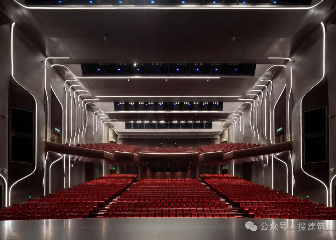 Just as Nantong, a city of connectivity, embodies diversity and inclusivity across different communities, the five halls of Nantong Grand Theatre reflect various interpretations of locality and affinity based on their distinct functional requirements. The interior design of each hall are uniquely styled and full of characters. However, from a technical perspective, these five theatres demonstrate a high degree of uniformity. All utilize glass fiber reinforced gypsum (GRG) panels with intricate textured surfaces as wall materials, designed to optimize acoustic performance to the fullest extent. Furthermore, the design of stage lighting, sound systems, and stage machinery exemplifies a relentless pursuit of modern performance excellency and immersive audience experiences, creating a cutting-edge artistic space for both spectators and performers. The Opera House serves as the centerpiece of the five halls. Audiences reach the auditorium through entrances on either side of the Opera House. The golden and dynamic vertical light strips, immediately evoke the elegance and purity of a world-class performance venue. The undulating vertical lines enhance the cohesiveness and depth of the space. The "light strips" on the walls can adjust their brightness and colors to suit different performance themes or conference settings. The seats, in rich shades of deep red, beautifully complement the golden walls, creating a striking visual harmony.