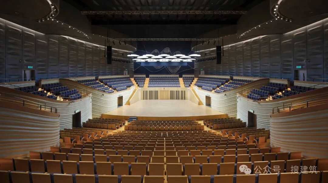 音乐厅以银灰色金属漆覆盖墙面,整体色调明亮轻快。通过音乐厅独特的内部环状走道,观众可以便捷地到达各个座位。池座及侧面座席墙面表面为不同的曲线,提供良好的反射声。管风琴位于舞台后的中轴上,其前方为合唱团席。舞台上方有一系列椭圆形彩釉玻璃反声板,具备自发光功能,将观众的注意力聚焦在舞台中央。音乐厅沉浸式视听体验,让人与建筑环境本身融为不可分割的整体,这是建筑亲和力的终极目标。