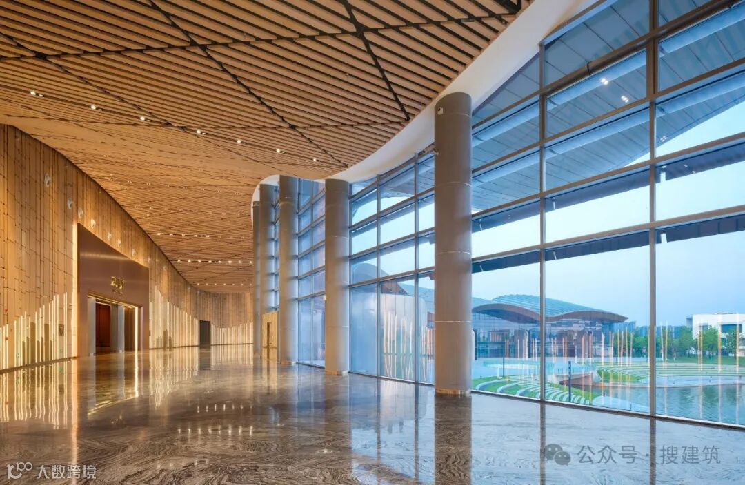 The main entrance reflects the Grand Theatre's respect for the city's cultural heritage, while the circular lobby is its response to "Qin Mountain and Pearl Waters" around Zilang Lake. Connecting all five halls, the circular lobby serves as the theatre's primary public space. Facing Zilang Lake, it offers unparalleled natural views. As a tribute to the lakeside scenery, the circular lobby directly accesses an outdoor viewing platform. From the platform, visitors can gaze at Lang Mountain at the western end of the corridor or step closer to lakeside, engaging in a visual dialogue with people strolling along the lakeside. Additionally, the landscape design adds a new layer between the building and the water, enriching the spatial experience. Between the city and the water, everything—people, events, and objects—becomes simultaneously an observer and the observed, creating a dynamic interplay of perspectives.